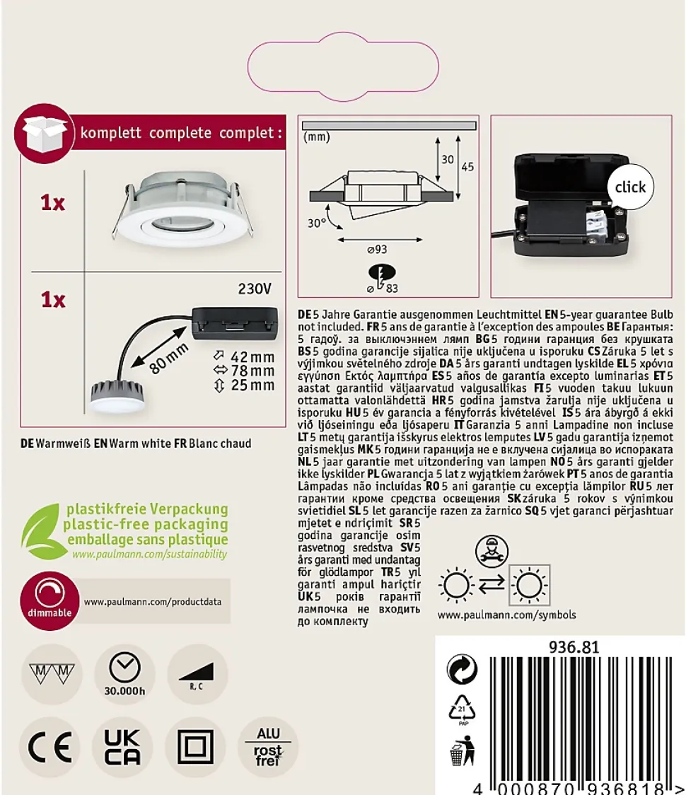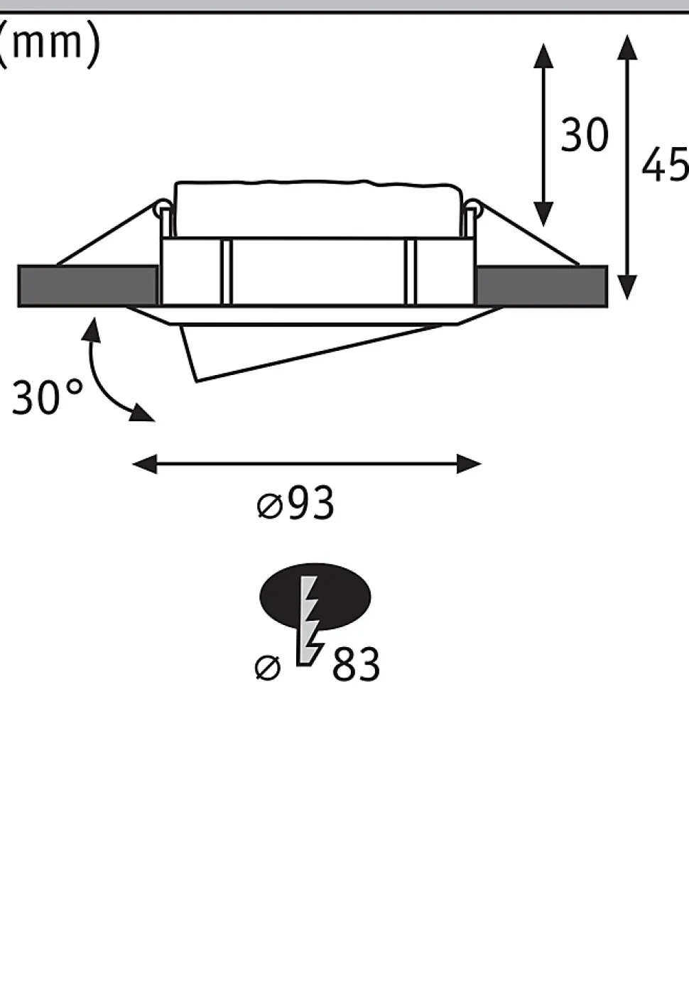 Kit composé de 1 luminaire avec module LED|Température de couleur: 2700K – Blanc chaud|Avec verre de protection satiné|Très plat : le montage peut s’effectuer même avec une faible profondeur de la cavité de seulement 30 mm.|Pour raccordement direct au secteur 230V|Protection IP : IP65 – Protection contre les jets d’eau|Intensité variable