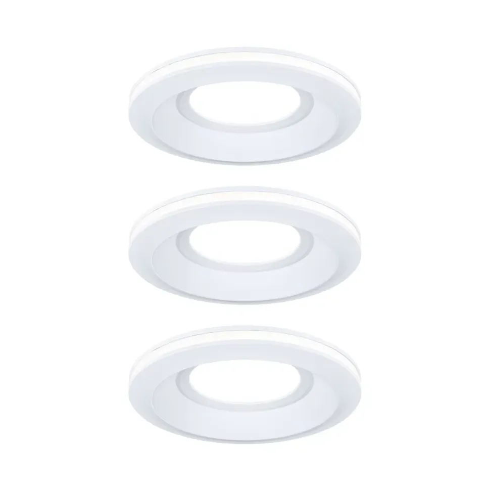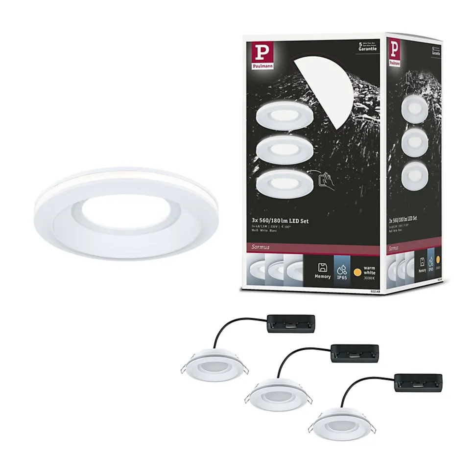 Kit de spots encastrés Sormus à 560 lm|Commande d’éclairage individuelle sur trois niveaux (gradable)|Un éclairage lumineux ou des accents lumineux décoratifs pour l’éclairage de la salle de bains|Température de couleur: 3000K – Blanc chaud|Protection IP : IP65 – Protection contre les jets d’eau|La fonction de mémoire enregistre le dernier niveau utilisé jusqu’à la prochaine mise en marche.|Geringe Einbautiefe|Montage simple et flexible grâce à la conception enchaînable