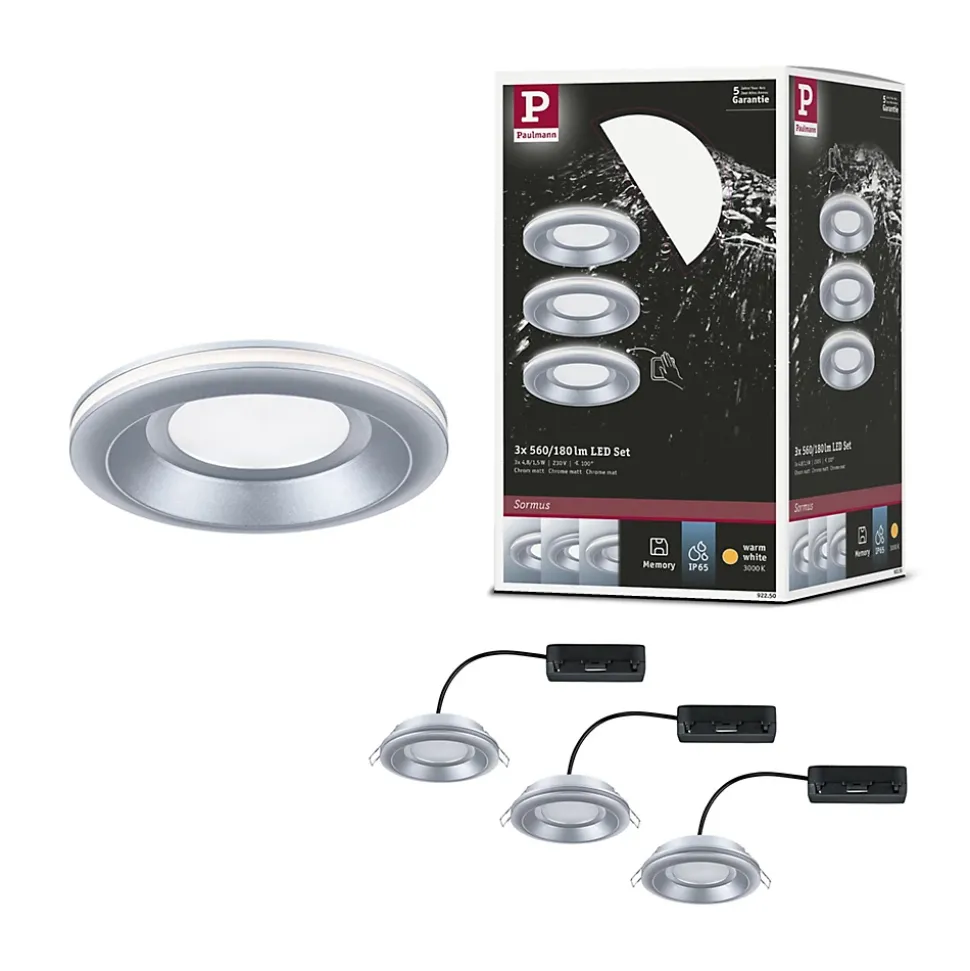 Kit de spots encastrés Sormus à 560 lm|Commande d’éclairage individuelle sur trois niveaux (gradable)|Un éclairage lumineux ou des accents lumineux décoratifs pour l’éclairage de la salle de bains|Température de couleur: 3000K – Blanc chaud|Protection IP : IP65 – Protection contre les jets d’eau|La fonction de mémoire enregistre le dernier niveau utilisé jusqu’à la prochaine mise en marche.|Geringe Einbautiefe|Montage simple et flexible grâce à la conception enchaînable