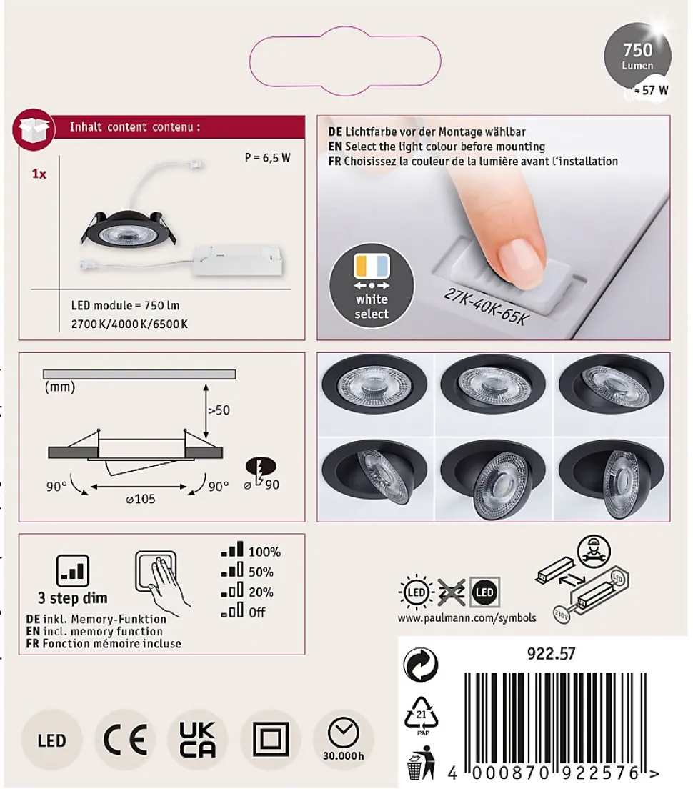 Un design attrayant et une technologie innovante pour des solutions d’éclairage efficaces|Faible profondeur de cavité de max. 50 mm|Un simple commutateur permet de faire varier la luminosité sur 3 niveaux|Montage sans outil en quelques secondes|Perfect for rooms needing flexible illumination options|Capacité de pivotement jusqu’à 180° pour des réglages d’éclairage personnalisés|Fonction White Select pour un choix individuel de la température de couleur (2700 K, 4000 K, 6500 K) avant l’installation