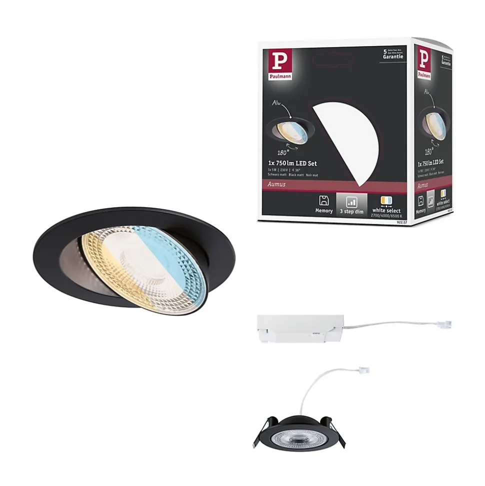 Le spot encastré Aumus en Noir crée une nouvelle référence en éclairage avec une capacité de pivotement jusqu’à 180° et une profondeur de cavité minimale d’à peine 35 mm. Avant l’installation, il est possible de sélectionner une des trois options (2700 K, 4000 K ou 6500 K) à l’aide d’un dip-switch pour choisir chaque température de couleur, grâce à la fonction White Select. En outre, le spot encastré offre une fonction pratique 3-Step-Dimm qui permet d’ajuster le niveau de variation sur 3 niveaux (100 %, 50 %, 25 %) à l’aide d’un commutateur mural classique. Grâce au boîtier de raccordement innovant, les spots encastrés s’installent en quelques secondes, sans outils. Avec leur design attrayant et leur technologie innovante, le spot encastré est le choix optimal pour tout espace nécessitant une solution d’éclairage flexible et efficace.