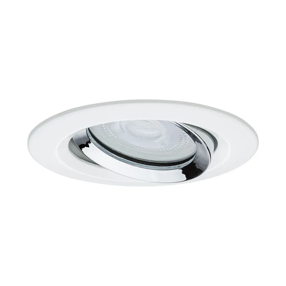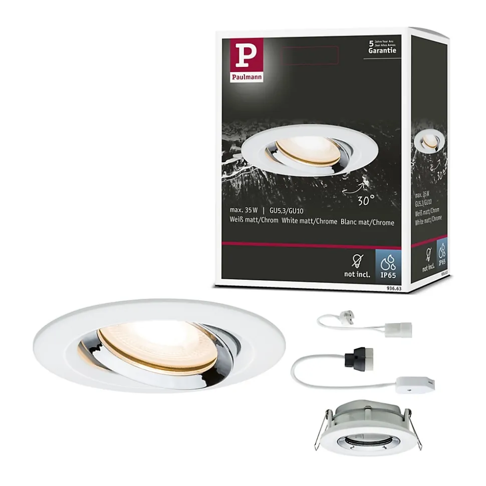 Le spot encastré Nova Plus rond en Blanc dépoli, Chrome convient aussi bien à l’équipement de nouvelles installations qu’au remplacement d’équipements existants. Il s’intègre dans les plafonds disposant d’un espace creux de 75 mm seulement. La fixation simple par ressorts de retenue laisse le plafond intact même après plusieurs montages et démontages. Leur variateur d’intensité permet un ajustement individuel de la luminosité offrant deux effets majeurs : vous jouissez d’une lumière de travail blanc chaud tout en baignant dans une ambiance cocooning. Grâce à sa capacité de pivotement, le spot peut être orienté individuellement. Avec la protection IP65, le luminaire est spécifiquement préservé de la pénétration des jets d’eau et convient donc parfaitement pour les locaux humides ou l’extérieur. Les ampoules vendues séparément s’installent facilement à l’intérieur de la bague de montage grâce à un bornier – nul besoin de circlip. Selon l’ampoule utilisée, la lampe est dimmable.