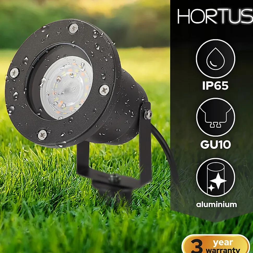 Spot Extérieur avec Piquet GU10 HORTUS Noir, Étanche IP65, Lampe de Jardin à Piquer, Spot de Jardin à EncastrerLes projecteurs de jardin à enfoncer sont un type d’éclairage extérieur qui sert à mettre en valeur des éléments du paysage tels que les arbres, les arbustes ou les parterres de fleurs.Dimensions [mm] : ✔️base : -✔️hauteur : 315 mm✔️largeur : ø98 mm✔️profondeur : 82 mm✔️distance entre les vis de montage : -✔️diaphragme : ø60 mm✔️longueur du câble : 250 mmCARACTÉRISTIQUES TECHNIQUES :✔️Type de montage : à enfoncer✔️Lieu de montage : sol✔️Type de raccordement : extrémités libres des câbles✔️Couleur : noir✔️Type de finition : sablé✔️Matériau : acier, aluminium, verre✔️Réglable : oui✔️Cache : transparent✔️Douille incluse : oui✔️Type de douille : GU10✔️Nombre de douilles : 1✔️Source lumineuse incluse : non✔️Puissance maximale [W] : 35 W✔️Tension nominale [V] : 220-240 V CA ✔️Fréquence nominale [Hz] : 50-60 Hz✔️IP : IP65✔️Classe de protection : I✔️Teneur en mercure : non