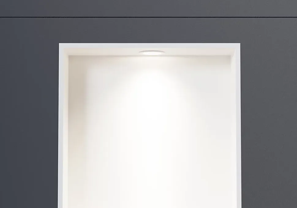 Spot encastrable LED Ø 45 mm – couleur de lumière blanc neutre – convient pour l’éclairage de niches murales ou d’autres espaces de vieUn spot LED encastrable offre un éclairage agréable qui illumine votre espace de vie de manière confortable et discrète. Ce spot LED est particulièrement adapté aux niches murales de la salle de bains. Le produit est équipé de l’indice de protection IP65 contre les jets d’eau et éclaire dans la couleur de lumière blanc neutre. Ce luminaire encastré peut également être utilisé dans d’autres espaces de vie.La couleur du cadre de montage peut-être commandée dans une couleur assortie à votre salle de bain.Veuillez sélectionner la variante souhaitée en haut de la page au début de l’offre. Nous vous recommandons de faire réaliser l’installation par un professionnel.Détails du produit Couleur du cadre de montage chrome, noir RAL 9005, blanc RAL 9003 Matière Aluminium Dimensions Ø 45×22,3 mm Profondeur d’encastrement 22 mm Dimension du trou Ø 40 mm Consommation 3 W Tension d’alimentation 220-240 V | 50/60 Hz Tension de sortie 9 V Courant 300 mA Couleur de lumière 4000 K, blanc neutre Flux lumineux/luminosité 280 lm Indice de rendu des couleurs (IRC) >90 Angle de rayonnement 36° Classe de protection IP65 protection contre les jets d’eau Classe d’efficacité énergétique G Détails supplémentaires Certifié CE, RoHS