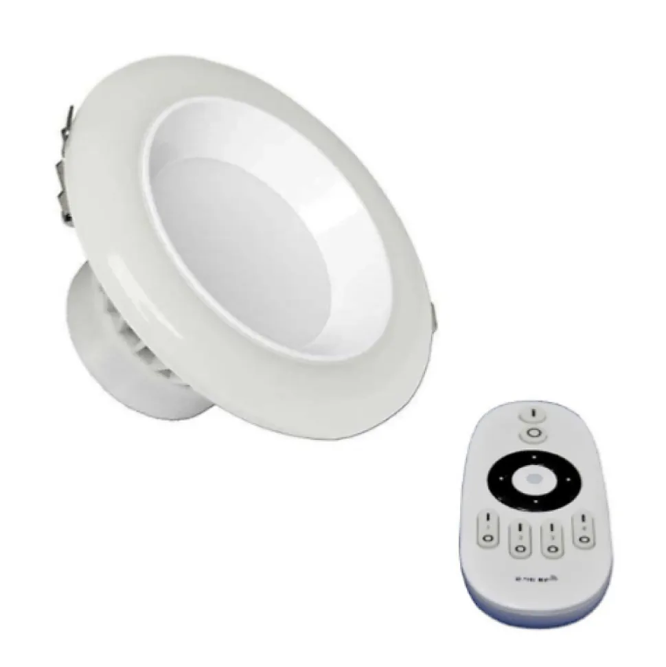 Ne passez pas à côté de notre puissant Spot LED Encastrable Lumière Variable 20W avec Télécommande et changez l’ambiance d’une pièce à votre gré grâce à sa télécommande ! Caractéristiques du Spot LED Encastrable Lumière Variable 20W avec Télécommande Puissance et lumière variable Ce produit est doté d’une puissance non-négligeable de 20W ainsi qu’un angle d’éclairage allant jusqu’à 120°. Son grand atout est qu’il est dimmable, grâce à sa télécommande, vous pourrez passer du blanc chaud au blanc froid en passant par le blanc neutre. Augmentez et diminuez la luminosité pour changer l’atmosphère de votre pièce, ce spot vous offrira une intensité lumineuse allant jusqu’à 1400 lumens, ce qui en fait un produit puissant. De plus, sa forme arrondie et sa couleur blanche lui permettent de s’adapter à toutes les situations, dans votre salon comme dans votre local professionnel. Installation Ce spot est très facile à installer, tout le nécessaire est inclus. Il est encastrable dans votre plafond ou au mur, si vous le souhaitez. Veillez à prévoir un diamètre d’encastrement d’environ 15cm. Concernant le branchement, notez que lorsque vous vous placez face au domino situé à l’arrière du spot LED, sous le petit couvercle à dévisser, le L se trouve sur votre gauche et le N sur votre droite. Fonctionnement de la télécommande Avant tout, vous avez besoin d’appairer la télécommande à votre spot LED. Pour cela, branchez votre spot mais laissez le éteint, restez appuyer quelques secondes sur la touche 1, 2, 3 ou 4. Allumez votre Spot LED et celui-ci va clignoter 3 fois pour vous indiquer qu’il est bien appairé. Grâce à cette télécommande, vous pouvez connecter plusieurs appareils, toujours grâce au même procédé mais en appuyant sur un bouton différent que lors du premier appairage. Découvrez à présent ses nombreuses possibilités: vous pouvez changer la couleur d’éclairage (blanc chaud, blanc neutre, blanc froid), passer votre spot LED en mode veilleuse en restant appuyer