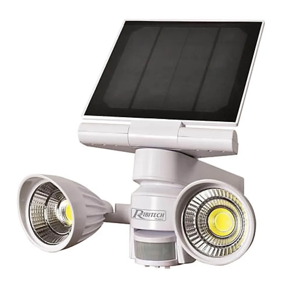 Spot solaire 2×4 watt 600 lumen IP44 avec détecteur, RIBIMEXProjecteur Solaire à LED 2 fois 4 W avec détecteur de mouvement.Utilisation en extérieur, sous abri.Panneau solaire : Corps et support de fixation en ABS.Panneau de 5V – 4W – 800mAhBatterie Li-ion 2 x 3,7V – 4000mAh.Dimension panneau 185 x 185mmRotation 360° – Inclinaison 60°, 45°, 30° et 0°Projecteurs : 2 projecteurs 4 W en ABSrotation des projecteurs dans toutes les directionsbouton ON/OFF à l’arrière du projecteur.Classe IP44LED type C.O.B – Puissance : 2 x 4 W – 600 lumensDétecteur orientable :Angle de détection 110°.Rotation sur 180°.3 niveaux de réglages :- LUX : Déclenchement : niveau d’obscurité désiré (5-20000 Lux)- TIME : Temporisation : durée d’éclairage de 10 s à 60 s- SENS : Détection : à partir de ± 4 m à ± 10 m max.