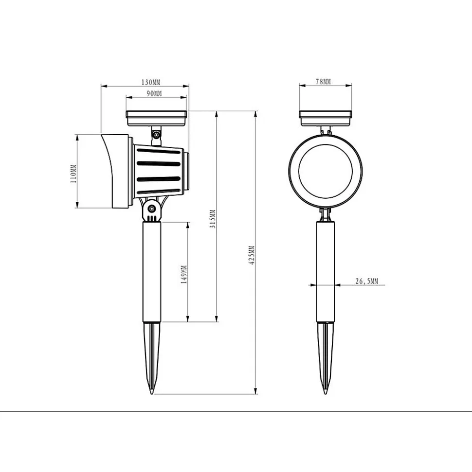Spot à énergie solaire très éclairantMatière : plastiqueNombre de Lumens : 45Durée maximum d’éclairage : 8 heuresInterrupteur on/off LED : 1 LED SMD blanche – 0,5WBatteries rechargeables : 2 x 600mAh Ni-Mh AADimensions produits : (voir le schéma technique parmi les images)H : 425 / 315 mm – largeur : 110 mm – profondeur : 130 mm