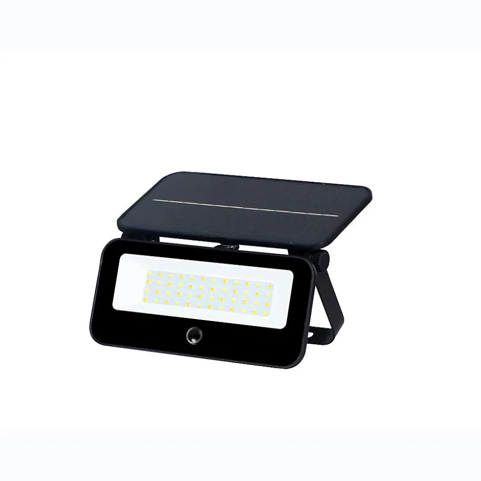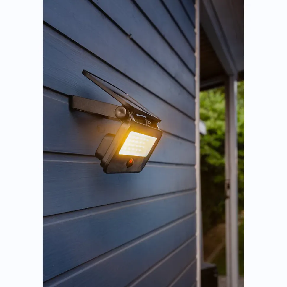 Projecteur mural extérieur solaire GALIX G2610 : boîtier aluminium et diffuseur en verre, 48 LED SMD 2835, 3 niveaux de luminosité (1200/600/250 lm) et sélection de température (chaud/mixt/froid), capteur PIR intégré (jusqu’à 3 m, 120°) avec délai 30 s, batterie rechargeable 1×18650 2600 mAh, panneau solaire inclinable, fixation murale fournie, garantie 24 mois.