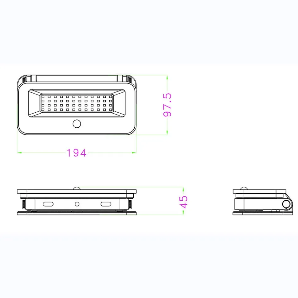 Spot mural très éclairant à énergie solaire avec détecteur de présenceMatière : Aluminium + Diffuseur en verreNombre de Lumens : 1200 – 600 – 250Durée maximum d’éclairage :* 180 détections (1200 lm) * 300 détections (600 lm) * 600 détections (250 lm)Interrupteur multifonctions :1) choix du type de lumière (chaude/froide/mixte)2) choix du la luminosité :* 100% (1200 lm) * 50% ( 600 lm) * 20% (250 lm)Durée de détection : 30 secondes après chaque détectionDistance de détection : jusqu’à 3mAngle de détection : 120°CFixation par vis fournisLED : 48 LED SMD 2835 (3000-4000-6500K)Batteries rechargeables : 1 x 2600mAh 3,7V Lithium 18650Dimensions produits : (voir le schéma technique parmi les images)Longueur : 193,5 -Profondeur : 42 -Hauteur : 97