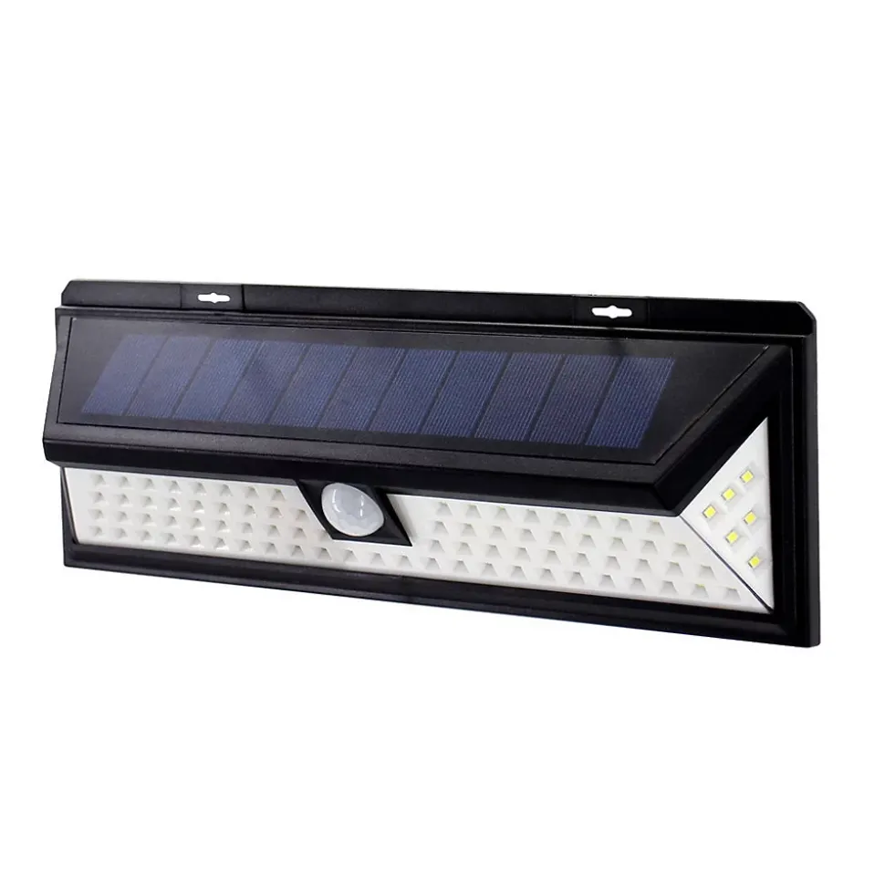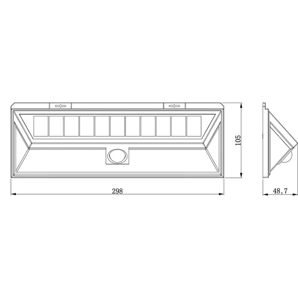 Spot mural très éclairant à énergie solaire avec détecteur de présenceMatière : plastiqueNombre de Lumens : 300 – 100Durée maximum d’éclairage : 7 heures (mode ON 100 lm)Interrupteur multifonctions :1) 300 lumens puis arrêt2) 100 lumens permanent3) 300 lumens puis 5 lumensDurée de détection : 30 secondes après chaque détection (Max. 260 allumages)Distance de détection : jusqu’à 10mFixation par vis fournisLED : 90 LED SMD blanchesBatteries rechargeables : 2 x 1200mAh 3,7V Li-on 18650Dimensions produits : (voir le schéma technique parmi les images)Longueur : 298 -Profondeur : 48,7 -Hauteur : 105