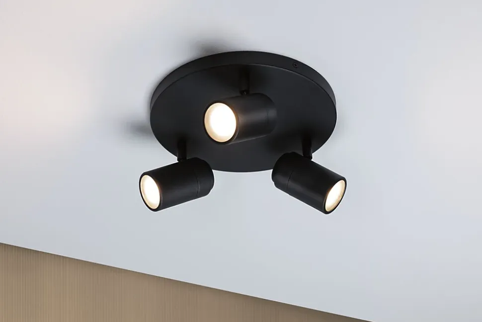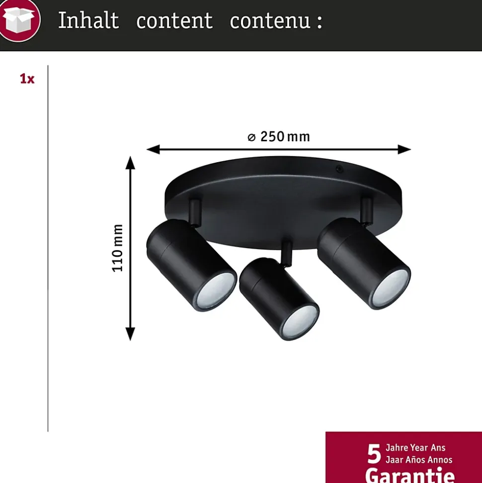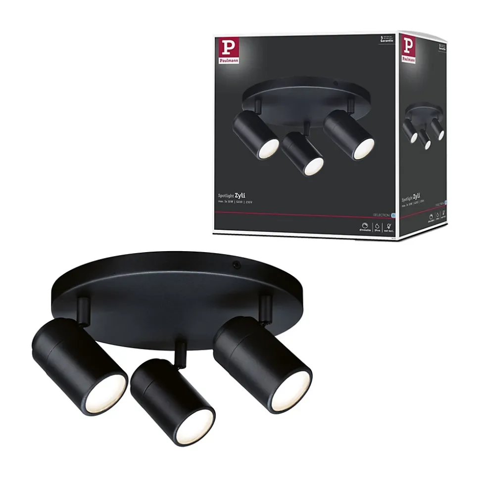 Avec son design sobre, le spot à trois flammes de la série Zyli en Noir mat s’intègre parfaitement comme plafonnier dans tous les intérieurs. Grâce à la protection anti-projections d’eau, le montage dans des pièces humides ne pose aucun problème. L’ampoule est au choix. Les réflecteurs à culot GU10 d’une puissance jusqu’à 10 watts conviennent parfaitement. Un ciblage facile en fonction de vos besoins de lumière grâce à des têtes de spot orientables. Selon l’ampoule utilisée, la lampe est dimmable.