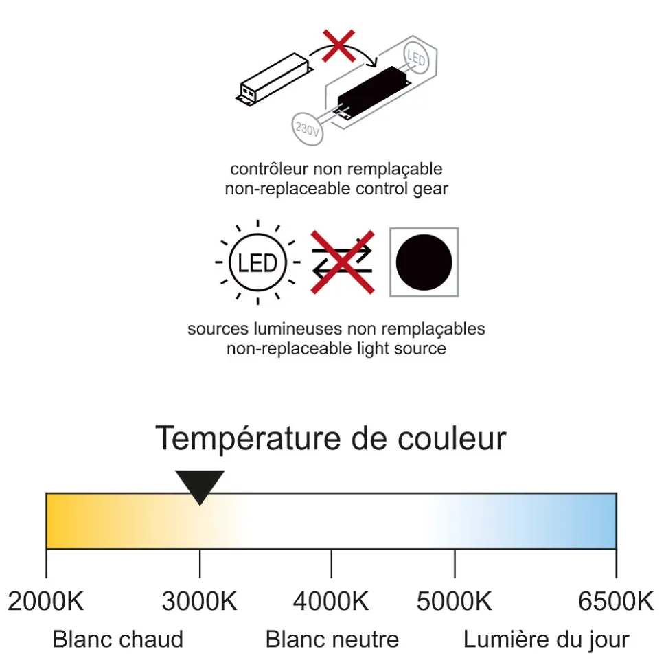 Éclairez votre salle de bain avec élégance et efficacité ! Ces spot sLED encastrable 4,8W offrent une lumière agréable de 400 lm en blanc chaud (3000K) et constituent une alternative économique et performante aux anciens spots halogènes de 40W.Un éclairage adapté aux environnements humidesSon indice de protection IP44 leur permet d’être installé en salle de bain et pièce d’eau (hors volume 1), garantissant une résistance à l’humidité et aux projections d’eau.Installation rapide et encombrement réduitFaible profondeur d’encastrement (30 mm), idéal pour les faux plafonds avec peu d’espaceBoîtier de connexion déporté avec connecteur rapide et traversant, permettant une installation en sérieOrientable à 30°, pour un éclairage ajustable selon vos besoinsLumière homogène et économie d’énergieSon angle de diffusion de 36° assure un éclairage ciblé et homogène. Grâce à sa LED intégrée, il consomme jusqu’à 90% d’énergie en moins qu’un spot halogène tout en offrant une longue durée de vie (15 000 heures).Caractéristiques techniques :Puissance réelle : 4.8WFlux lumineux : 400 lm (83 lm/W)Ancienne norme 2012 : A+Nouvelle norme 2021 : FTempérature de couleur : Blanc chaud (3000K)Indice de protection : IP44 (parfait pour zones humides hors zone 1)Durée de vie : 15 000 heuresAngle de diffusion : 36°Dimensions : 87×30 mm (perçage 68 mm)Tension : 220-240VGarantie : 3 ansNormes : CE, ROHS, EMCRemplacementCe spot n’est pas compatible avec les installations contenant de la laine de verre.Si vous remplacez des ampoules MR16, retirer les tranformateurs et brancher en 230V