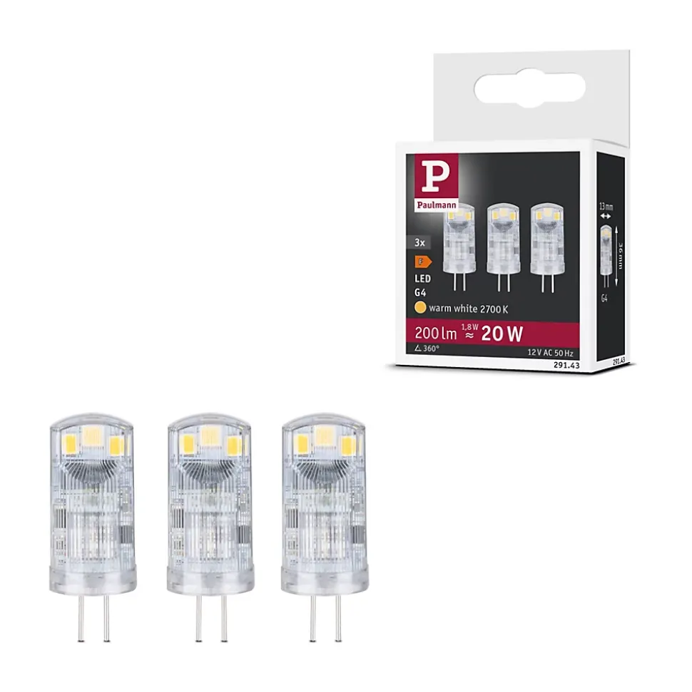 Ces LED avec culot à ergots G4 de 200 lumens en kit de 3 sont de petite taille, compactes et puissantes. Elles constituent une bonne alternative LED aux lampes halogènes basse tension. En les remplaçant, on bénéficie de deux avantages : le culot à ergots a une consommation nettement inférieure tout en offrant une durée de vie bien supérieure à celle de ses prédécesseurs. Elles conviennent très bien pour une utilisation dans des luminaires de petite taille ou des têtes de spots et produisent une diffusion de la lumière parfaite et uniforme.Les lampes LED Paulmann portant le label Eye friendly produisent une lumière confortable qui préserve les yeux. Que ce soit pour travailler, lire ou se détendre, les lampes contribuent à un meilleur confort visuel.