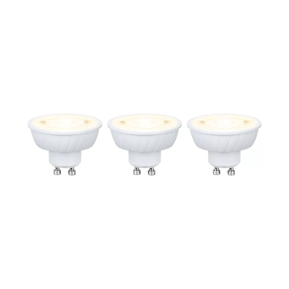 Ampoules GU10 en kit pratique de 3|Hauteur d’encastrement particulièrement faible de 37 mm|Idéal pour les spots encastrés dans les faux plafonds|Température de couleur: 2700K – Blanc chaud|Rendu des couleurs CRI ≥ 80 pour des couleurs naturelles et vives|Durée de vie longue: 25.000 h|S’adapte à toutes les douilles GU10 disponibles dans le commerce
