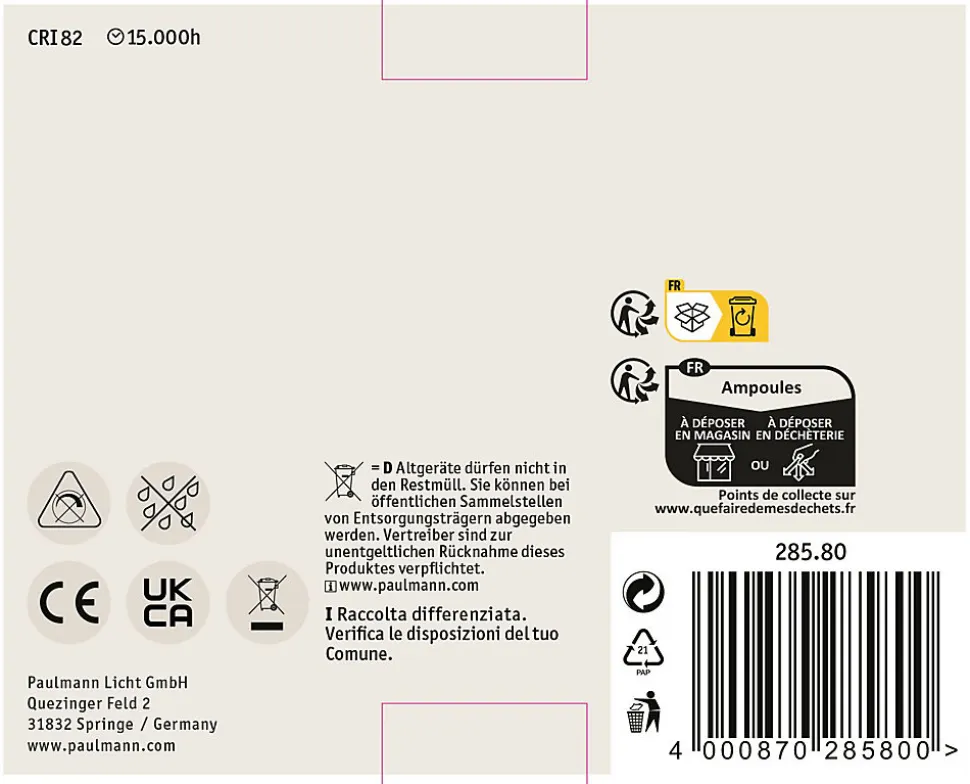 Les réflecteurs R50 avec douille E14 assurent une lumière dirigée dans les luminaires en suspension, les spots et les projecteurs. Ils diffusent la lumière uniquement vers l’avant et mettent en valeur la décoration ou les murs entiers par un éclairage ciblé. Avec le pack multiple 3×5,5 W, vous pouvez vous équiper en technologie LED efficace de manière économique ou vous approvisionner en vue de futurs travaux. Les lampes LED Paulmann portant le label Eye friendly produisent une lumière confortable qui préserve les yeux. Que ce soit pour travailler, lire ou se détendre, les lampes contribuent à un meilleur confort visuel.