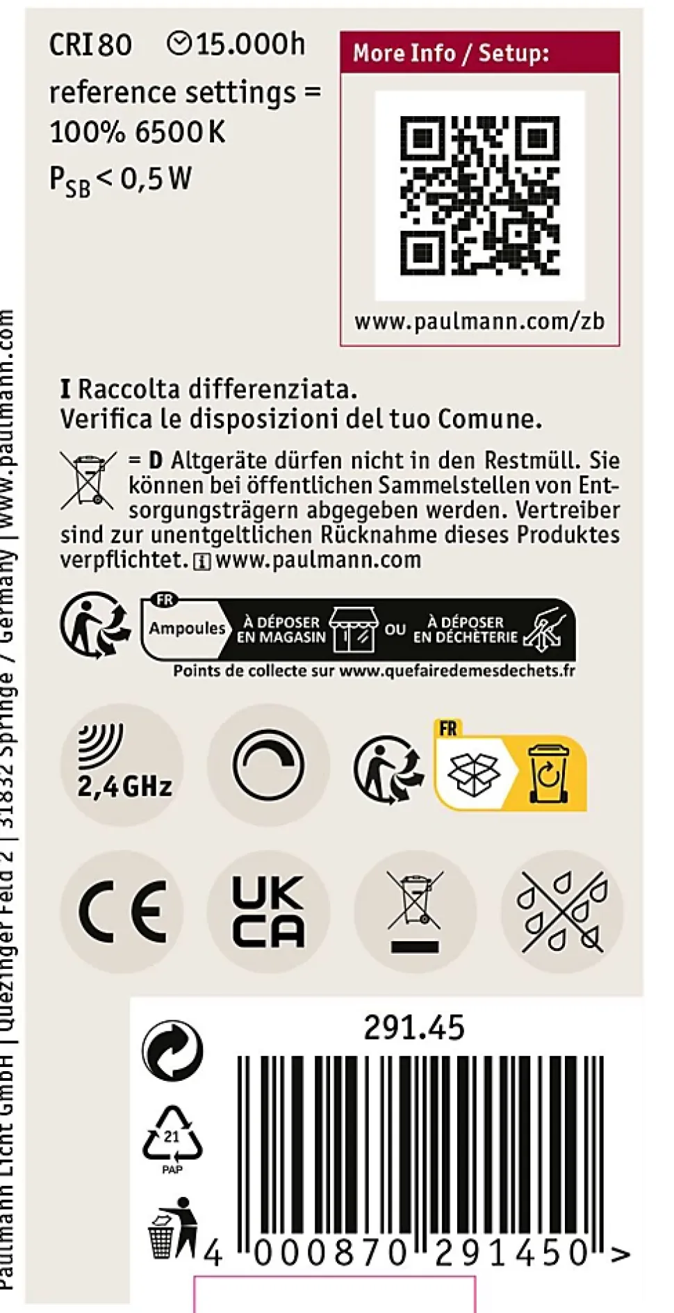 L’ampoule avec RGBW+, une puissance de 11W et 1055lm diffuse un éclairage uniforme agréable. L’ampoule est compatible avec les douilles E27 conventionnelles. L’ampoule est compatible Zigbee 3.0 3.0. ZigBee est un protocole de transmission radio qui met en réseau les appareils de différents fabricants. Selon l’ambiance désirée, vous pouvez choisir entre un blanc chaud véritable, une lumière colorée et d’autres effets différents. Les lampes LED Paulmann portant le label Eye friendly produisent une lumière confortable qui préserve les yeux. Que ce soit pour travailler, lire ou se détendre, les lampes contribuent à un meilleur confort visuel.