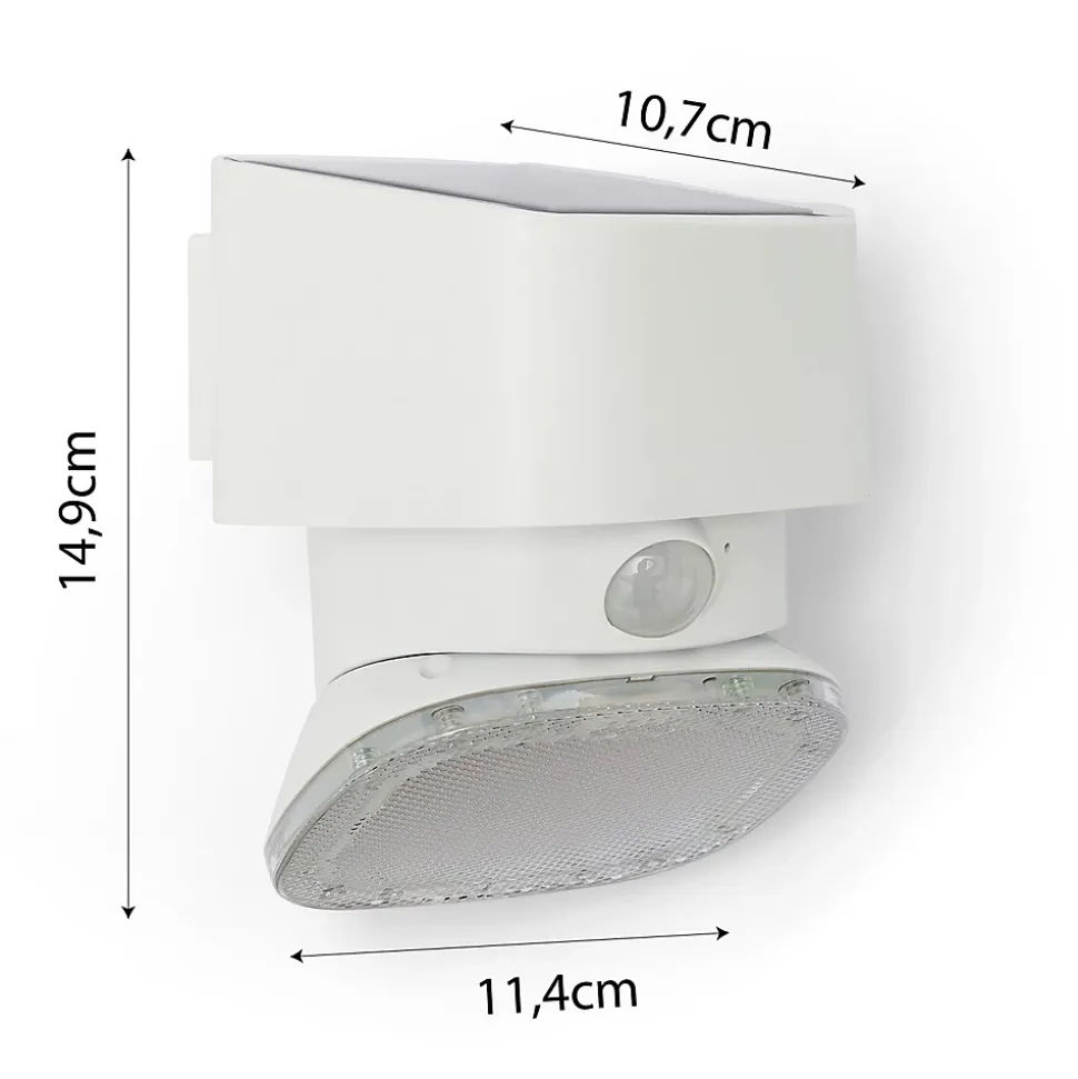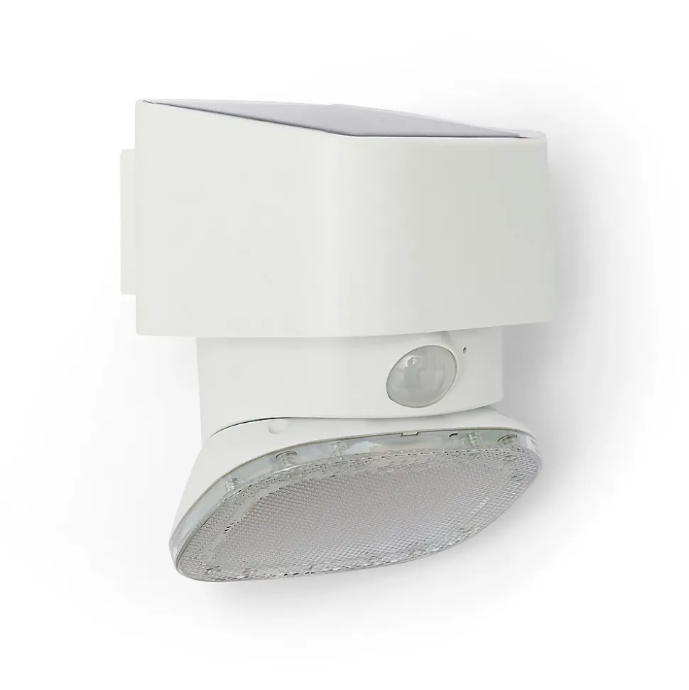 Spot Mural LED Solaire : Classique, simple, beau. Lampe solaire d’extérieur LED 2000 lumens avec détecteur de mouvement. Lumière compacte et orientable : éclaire tous les recoins ! La lampe embarque des LED SMD de dernière génération avec diffuseur haute performance : la lumière est homogène ; lumière 4000K : ni trop chaude ni trop froide.Lampe solaire : Cette lampe solaire avec détecteur de mouvement se recharge le jour grâce à l’énergie solaire et s’allume automatiquement dans l’obscurité ou la nuit. Elle fonctionne à l’énergie solaire : elle ne nécessite aucun câblage et utilise une énergie gratuite et éternellement renouvelable. Il est recommandé de l’installer dans des zones particulièrement ensoleillées afin de recharger les batteries au maximum de leur capacité et ainsi profiter d’un spectacle unique la nuit !Spot solaire LED en polycarbonate anti-UV et ABS ; design contemporain et extrêmement raffiné ; IP44 : il résiste aux chocs et aux agents atmosphériques ; la partie électronique est particulièrement résistante à l’eau.Fonctionnement : La lampe se recharge pendant la journée, grâce aux rayons solaires. 4 modes d’utilisation : éclairage continu 50 lumens + détecteur de mouvement (2000 lumens pendant 10 secondes) ; lumière éteinte mais détecteur de mouvement actif (2000 lumens pendant 10 secondes) ; éclairage continu 50 lumens (le détecteur de mouvement est désactivé).Equipée d’un panneau solaire monocristallin de 1W et d’une batterie Li-Ion de 2000mAh qui garantit jusqu’à 8 heures d’autonomie (selon la charge reçue au cours de la journée), bien au-dessus des standards du marché. Elle peut être fixé à l’aide de chevilles (fournies).
