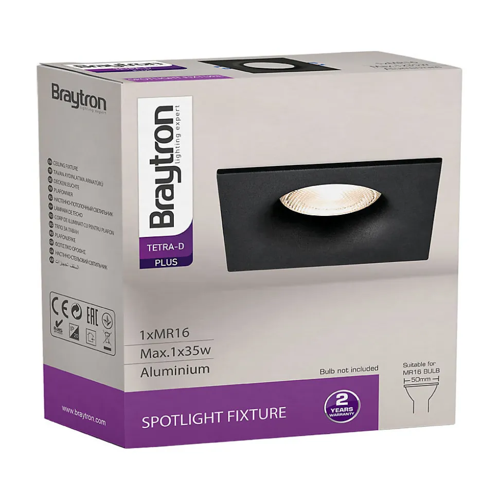 Ce support de spot Tetra D1 carré noir MR16 GU10/GU5.3 se complète avec une ampoule MR16 GU5.3/GU10 et la douille qui correspond. Son corps est en aluminium avec d’excellentes finitions et son design incurvé lui permet de diffuser la lumière sans éblouissement. Pour l’installation, vous devez disposez d’un faux plafond pour pouvoir encastrer le spot et le fondre dans le décor. La pose au plafond est simple et rapide, grâce aux fixations à ressorts. L’ampoule MR16 GU5.3/GU10 s’installe sans l’aide d’aucun outil, car elle se clipse fermement au support. Nous vous conseillons l’utilisation d’ampoules LED à faible consommation d’énergie. Elles s’adaptent parfaitement aux supports de spots et permettent de réaliser jusqu’à 85% d’économie d’énergie. Elles sont idéales en remplacement des anciennes ampoules halogènes énergivores. L’indice de protection IP20 impose une installation à l’intérieur de l’habitat. Le support de spot Tetra D1 carré noir, convient aussi parfaitement aux locaux commerciaux comme les magasins, bureaux, restaurants, hôtels.. Ampoules et douilles non incluses. Dimensions : Profondeur : 31mm Longueur/Largeur : 89x89mm Poids :