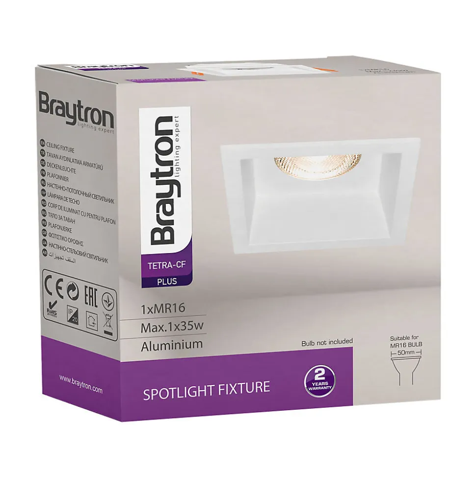 Ce support de spot Tetra S2 carré blanc MR16 GU10/GU5.3 se complète avec une ampoule MR16 GU5.3/GU10 et la douille qui correspond. Son corps est en aluminium avec d’excellentes finitions et son design incurvé lui permet de diffuser la lumière sans éblouissement. Pour l’installation, vous devez disposez d’un faux plafond pour pouvoir encastrer le spot et le fondre dans le décor. La pose au plafond est simple et rapide, grâce aux fixations à ressorts. L’ampoule MR16 GU5.3/GU10 s’installe sans l’aide d’aucun outil, car elle se clipse fermement au support. Nous vous conseillons l’utilisation d’ampoules LED à faible consommation d’énergie. Elles s’adaptent parfaitement aux supports de spots et permettent de réaliser jusqu’à 85% d’économie d’énergie. Elles sont idéales en remplacement des anciennes ampoules halogènes énergivores. L’indice de protection IP20 impose une installation à l’intérieur de l’habitat. Le support de spot Tetra S2 carré blanc, convient aussi parfaitement aux locaux commerciaux comme les magasins, bureaux, restaurants, hôtels.. Ampoules et douilles non incluses. Dimensions : Profondeur : 46mm Longueur/Largeur : 84x84mm Poids :