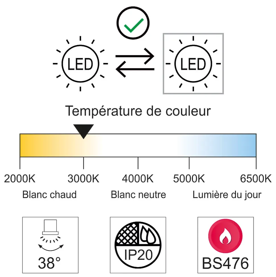 Ce support de spot GU10 est idéal pour l’éclairage des pièces à vivre telles que le salon, les couloirs et les chambres. Son étanchéité à l’air prévient les ponts thermiques et limite la perte de chaleur, conformément aux normes BBC de la RE2020, garantissant ainsi une meilleure efficacité énergétique.Sécurité et installation simplifiéeÉtanchéité à l’air : un joint intégré empêche les déperditions de chaleur vers le faux plafond.Protection thermique retardateur de flamme (90 min – BS476) pour une sécurité accrue.Branchement sécurisé : support relié à la terre pour une protection optimaleUn éclairage agréable et efficaceAmpoule GU10 de 6W incluse (équivalent 35W) pour une consommation réduite.Blanc chaud (3000K), idéal pour une ambiance chaleureuse et accueillante.Angle de diffusion de 38° pour un éclairage ciblé et homogène.Caractéristiques techniquesType : Spot encastrableAmpoule incluse : GU10 LED 6W – 450lm – 3000K (blanc chaud)Ancienne norme 2012 : A+Nouvelle norme 2021 : FNorme BBC (RE2020) : Oui (étanchéité à l’air)Indice de protection : IP20Puissance équivalente : 35W halogèneAngle de diffusion : 38°Connexion : Automatique, sans tournevisRetardateur de flamme : 90 min (BS476)Tension : 220-240VDimensions : Ø87×92 mm mm, perçage Ø75 mmCouleur du cadre : BlancDurée de vie : 15 000 heuresGarantie : 2 ansUne solution d’éclairage fiable et durableApplications :Pièces à vivre, chambres, couloirs