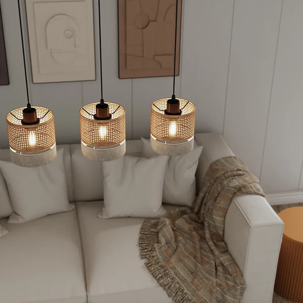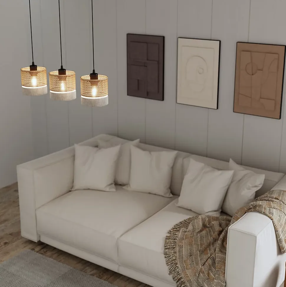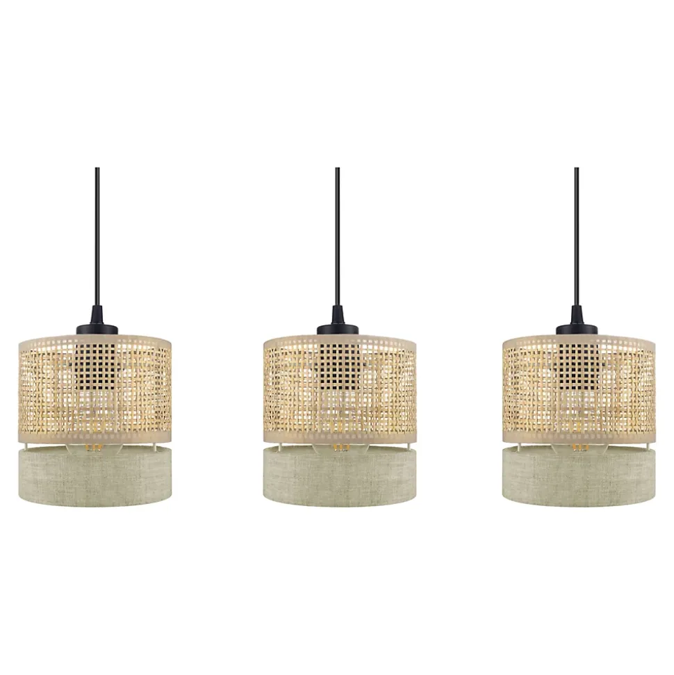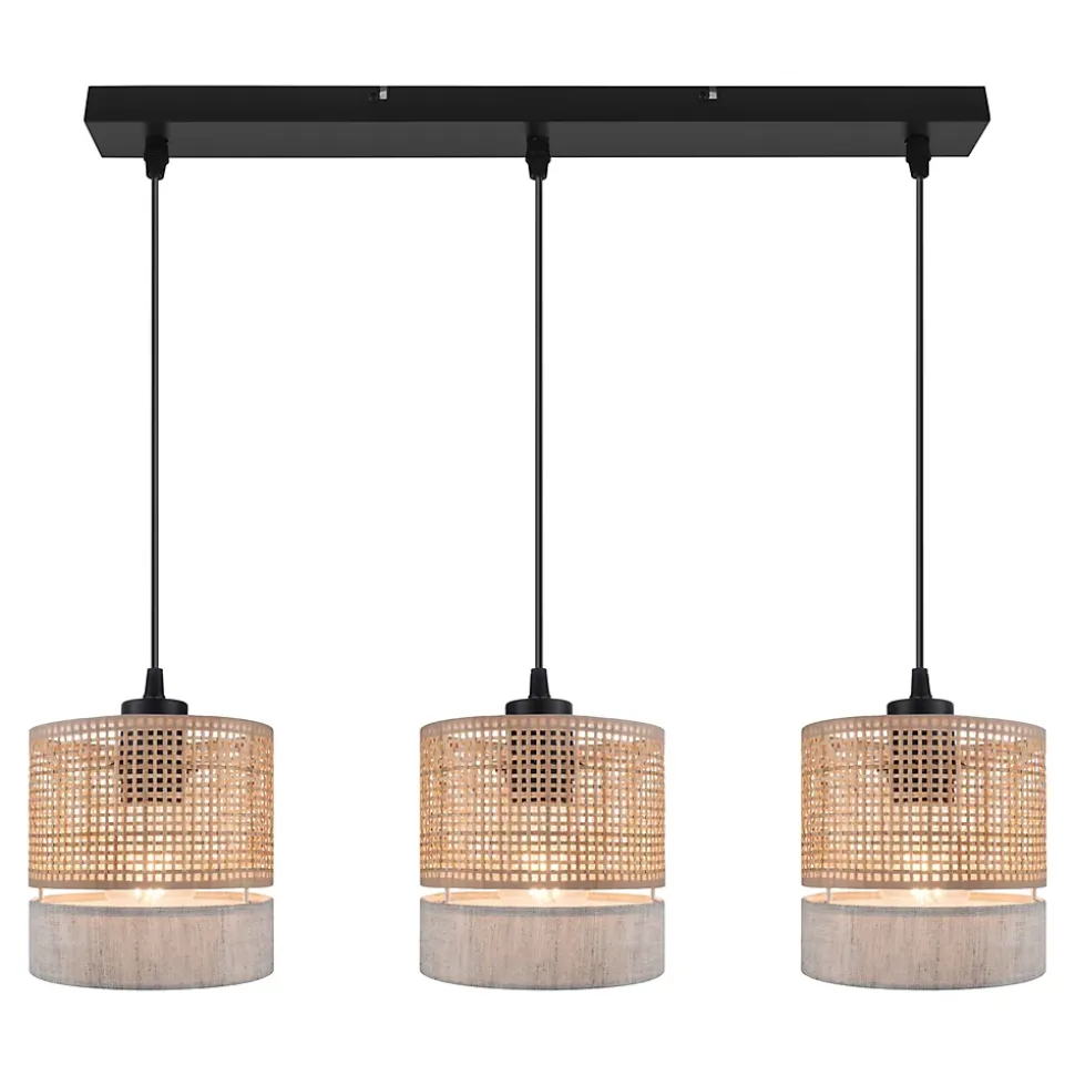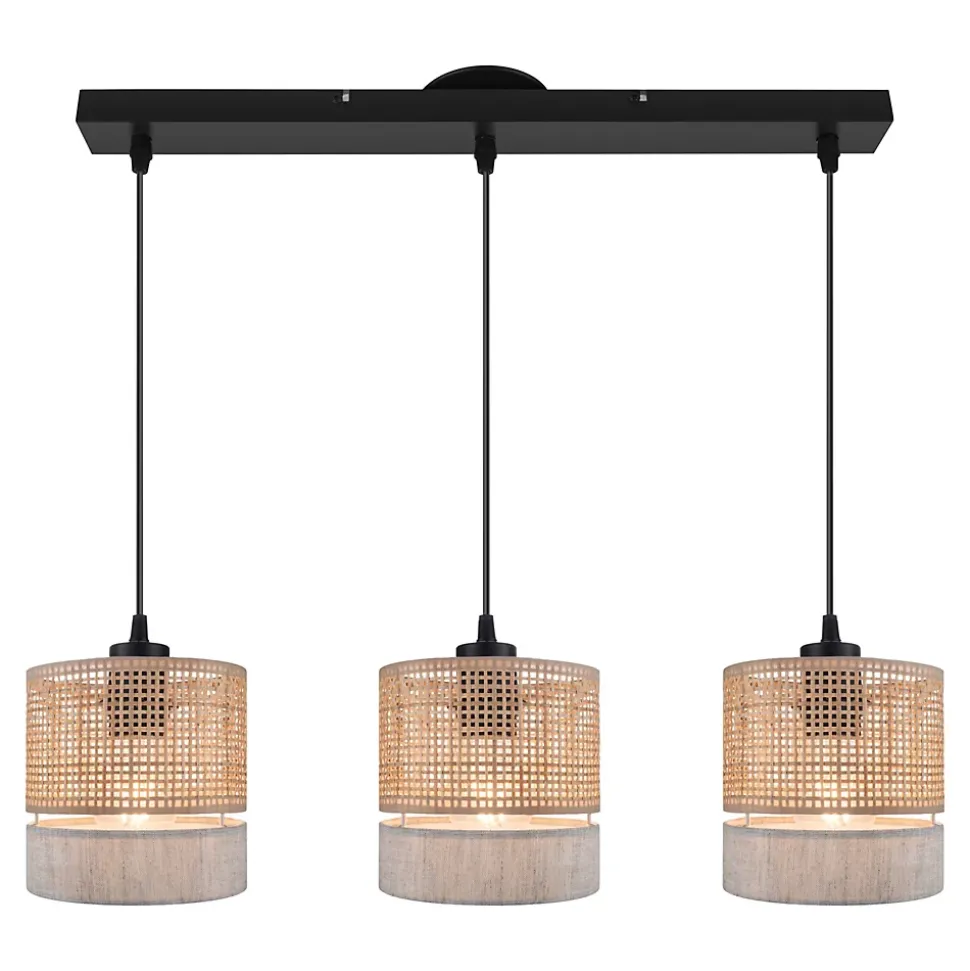 Suspension 3 lampes rotin et métal noir E27 15W H.110cm GoodHome Conebill