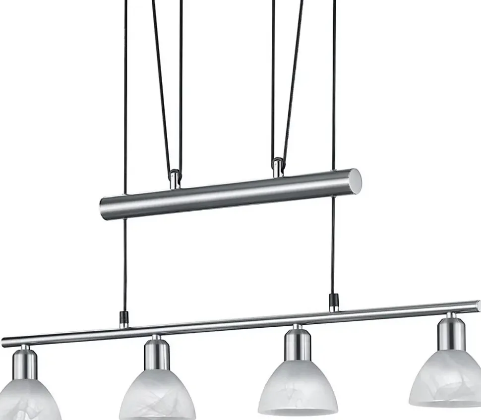 Les caractéristiques techniquesLa suspension Led Levisto de Trio est équipée de 4 ampoules LED E14 incluses, chacune offrant 470 lumens à 3000 Kelvin (blanc chaud) pour une lumière confortable et efficace. D’une puissance de 4,9W par ampoule, ce luminaire consomme peu d’énergie tout en garantissant une belle qualité d’éclairage. Grâce à la technologie LED, vous bénéficiez d’une longue durée de vie de 25 000 heures et d’un allumage instantané sans échauffement.Les avantages esthétiquesSon design élégant et discret associe un corps en nickel mat à des diffuseurs en verre couleur albâtre. Il s’intègre aussi bien dans les intérieurs modernes que classiques, ajoutant une touche de sophistication sans excès. L’effet albâtre diffuse une lumière douce et homogène, parfaite pour l’espace repas.Installation et dimensionsLa hauteur réglable entre 95 et 160 cm grâce au système de suspension yoyo rend ce luminaire très adaptable. Avec ses 80 cm de largeur et 11 cm de profondeur, il convient parfaitement au-dessus d’une table. Il est classé IP20 et ne convient qu’à un usage intérieur.