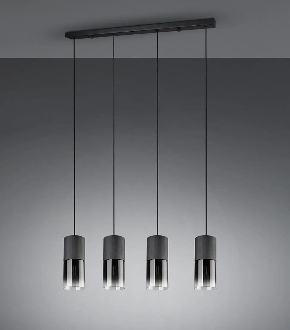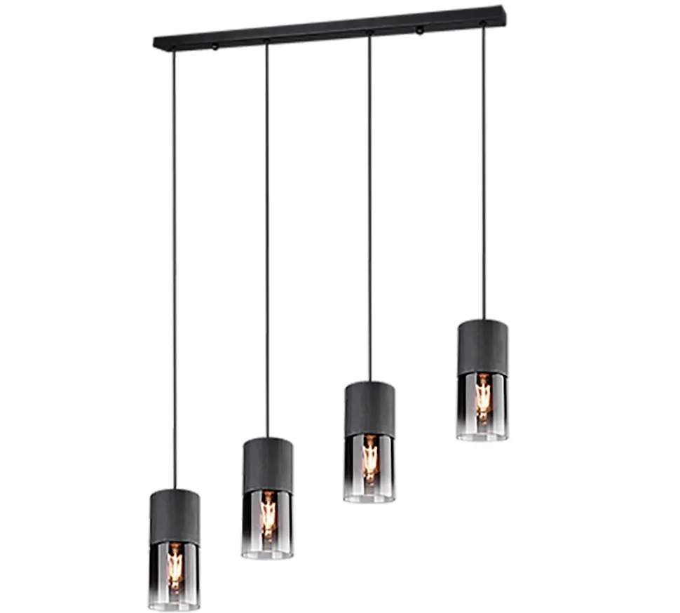 Suspension Robin : Un éclairage minimaliste et chaleureuxAjoutez une touche d’élégance moderne à votre intérieur avec la suspension Robin de Trio Lighting. Son design minimaliste avec des abat-jour en verre fumé crée une atmosphère à la fois élégante et chaleureuse, parfaite pour tout espace de vie ou de travail.Personnalisation de la lumièreAvec son abat-jour en verre fumé, cette suspension offre une source de lumière visible qui vous permet de personnaliser l’expression lumineuse de votre espace. En choisissant les ampoules décoratives qui correspondent à vos préférences, vous pouvez modifier l’intensité, la couleur et la forme de la lumière, pour une lampe complètement unique et adaptée à vos besoins.Caractéristiques du produitDimensions : Largeur 80 cm, Hauteur 150 cmType de filetage : 4 x E27Puissance : 4 x 28W max (ampoules non incluses)Matériaux : Verre fumé (abat-jour), Métal noir mat (corps)Indice de protection : IP20Alimentation : 230VUne gamme variée pour tous les stylesLa suspension Robin fait partie d’une série complète avec d’autres modèles : suspension en grappe de 3 lampes, lampe de table, et plus encore. Trouvez celui qui correspond parfaitement à votre style !