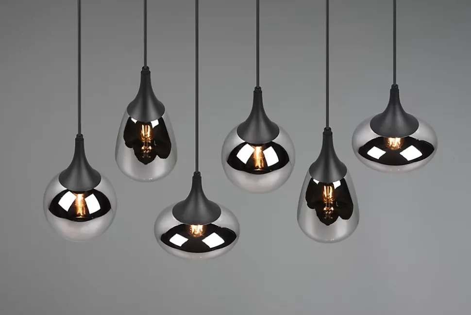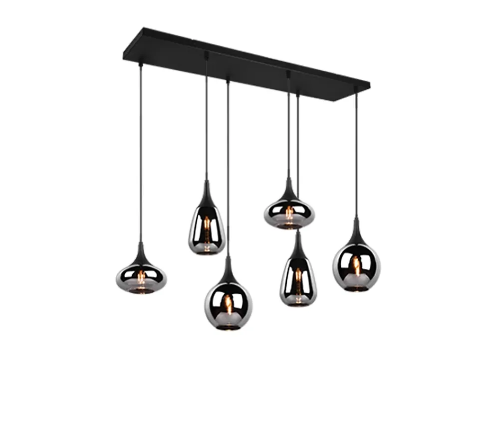 Les caractéristiques techniquesLa suspension Lumina de Trio combine harmonieusement verre chromé et métal noir mat pour un rendu lumineux saisissant. Elle est dotée de six abat-jour aux formes différentes, conçus en verre vaporisé chrome, pour une diffusion élégante de la lumière. Le luminaire fonctionne avec six ampoules E14 (non fournies), d’une puissance maximale de 40W chacune. Pour plus d’efficacité énergétique, l’usage d’ampoules LED est recommandé.Les avantages esthétiquesCe luminaire se distingue par son design moderne et sophistiqué. La combinaison des matières et les formes variées des abat-jour en font une pièce décorative de caractère, idéale pour votre salle à manger ou votre salon. Le coloris sobre permet une parfaite intégration dans tout style d’intérieur.Installation et dimensionsLa suspension Lumina est réglable en hauteur et se fixe facilement au plafond. Avec une largeur de 93,8 cm, une profondeur de 34,5 cm et une hauteur de 150 cm, elle s’impose comme un élément central dans la pièce. Elle est classée IP20 pour un usage intérieur exclusivement.