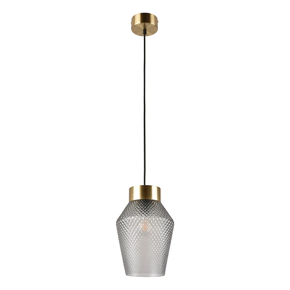 Suspension en verre sculpté soufflé à la bouche. Equipée d’un cordon textile et d’un pavillon métal adaptable DCL.Coloris : fumé. IP20. D19cm – H28cm – HT107cm. Classe 2. E27-60W.