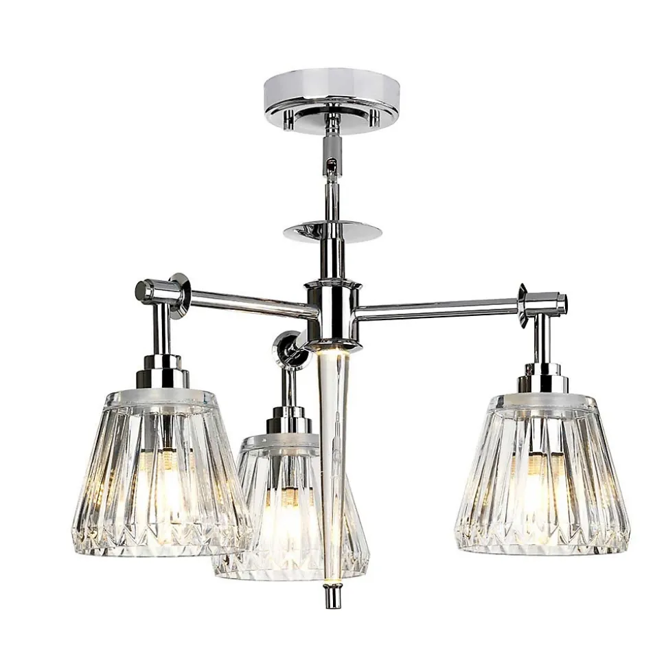 La gamme Agatha présente un indice de protection IP44 pour les salles de bains, mais peut également être utilisée dans les couloirs et autres espaces de vie. Une LED intégrée éclaire la tige en acrylique de l’applique murale et de la suspension à 3 lampes. La lumière scintille à travers les abat-jours en verre taillé transparent de tous les modèles. La collection est disponible en deux finitions : chrome poli et nickel brossé.