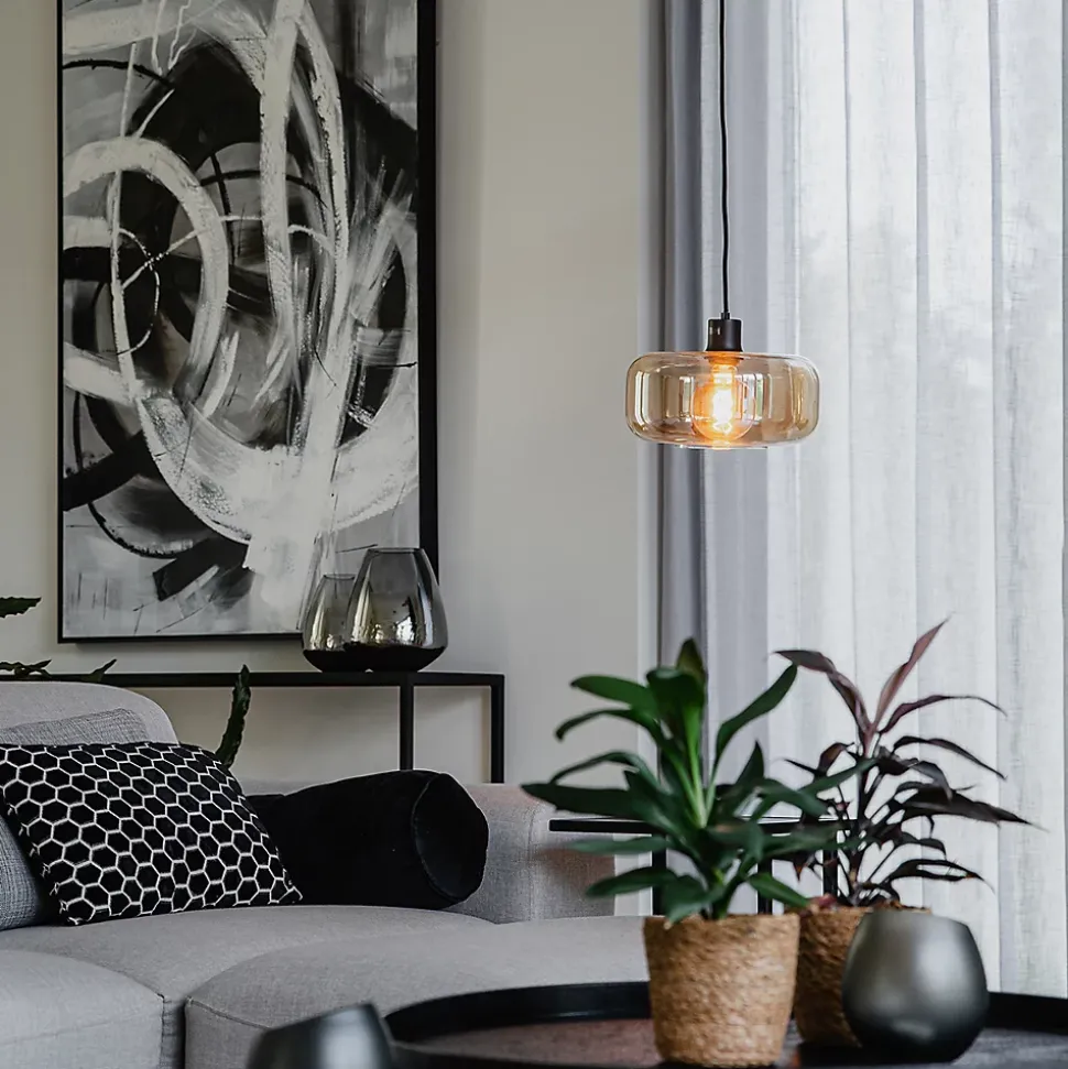 Complétez votre intérieur avec Bizle ! Cette suspension est finie en beige et noir et est faite de verre ambre avec de l’acier. Bizle est un véritable must-have dans un intérieur Art Déco ! La lampe a un diamètre de 28 cm et une hauteur de 142,5 cm. N’oubliez pas de commander une ampoule avec un culot E27 pour compléter la lampe. Vous avez besoin de moins de lumière ? Bizle est dimmable, mais un variateur n’est pas inclus. Vous ne pouvez pas vous tromper avec Bizle : vous allez vouloir cette suspension dans votre maison, n’est-ce pas ?
