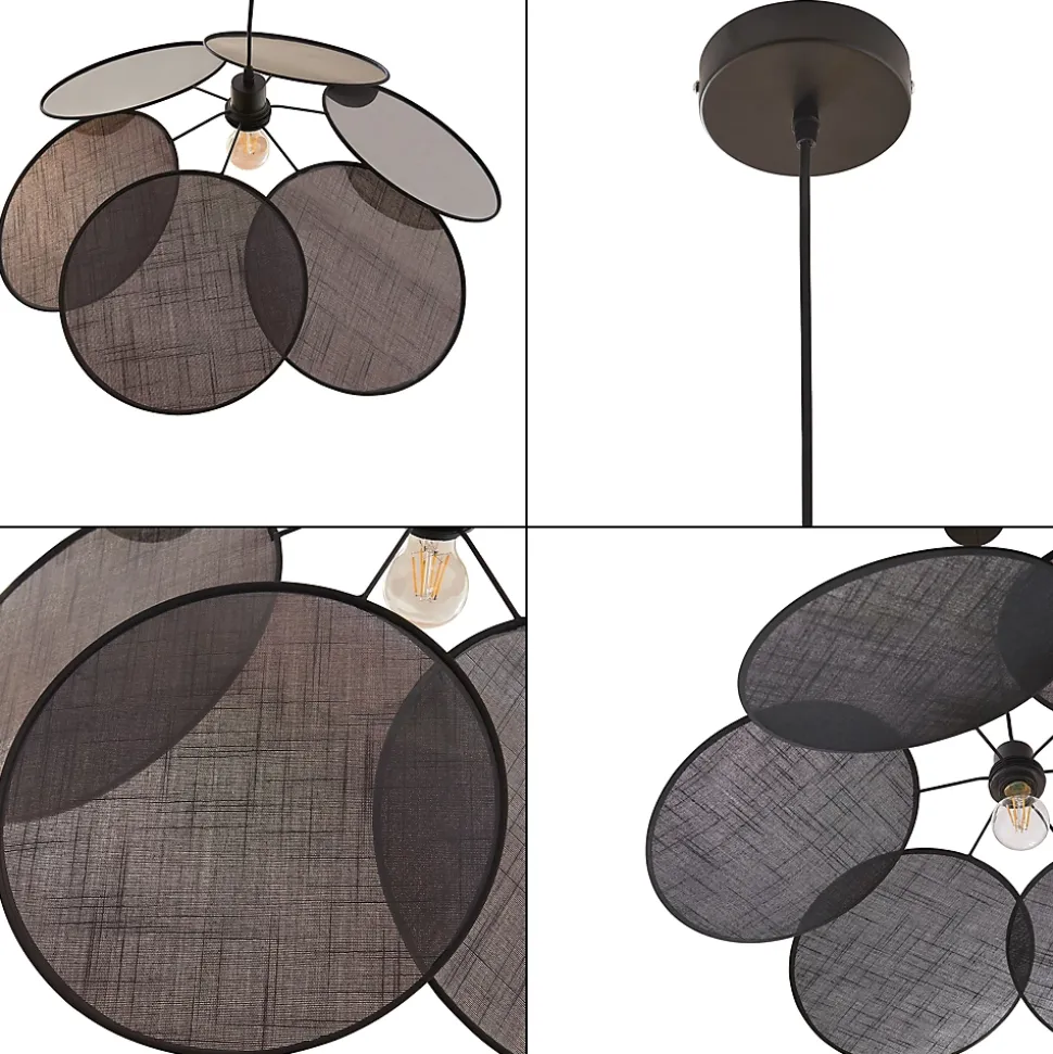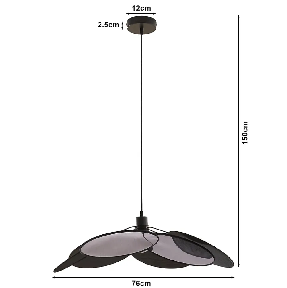 SuspensionLa suspension séduit par son design unique et élégant et s’intègre parfaitement dans n’importe quel environnement de vie ou de travail. Elle s’harmonise avec différents styles d’intérieur, du moderne au classique.Le matériel de montage nécessaire est inclus dans la livraison, vous permettant de le fixer rapidement au plafond. Son assemblage simple vous permet d’éclairer aisément votre intérieur.La suspension se compose de plusieurs grands abat-jours en tissu disposés en cercle qui se chevauchent pour former un ensemble décoratif en forme de fleur. Points forts du produit :- suspension moderne pour une utilisation en intérieur- design harmonieux pour les salons, chambres à coucher ou espaces de travail- abat-jours en tissu superposés à motif floral pour des accents lumineux épurés- installation sans effort grâce aux accessoires fournis- douille robuste pour un éclairage stable et sécuriséCaractéristiques techniques :- douille : 1 x E27, max. 60 W (livrée sans ampoule)- tension : 230 V, 50 Hz- indice de protection : classe de protection IDimensions :- hauteur totale : 150 cm- abat-jour (l x p) : 76 x 76 cm- fixation au plafond (h x Ø) : 2,5 x 12 cmMatière :- fixation au plafond : métal- abat-jour : tissu (100 % polyester)Couleur :noirContenu de la livraison :1 x suspension (ampoules non fournies)Produit de la marque :lux.pro