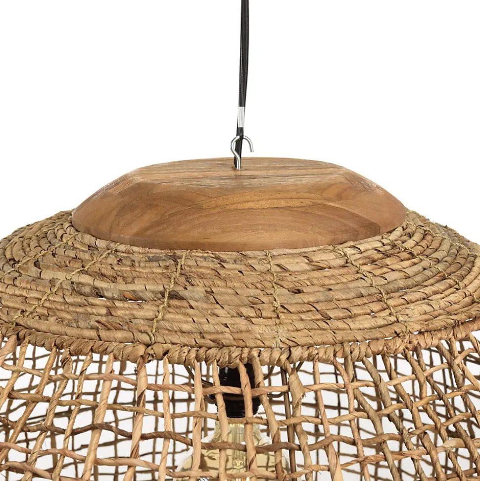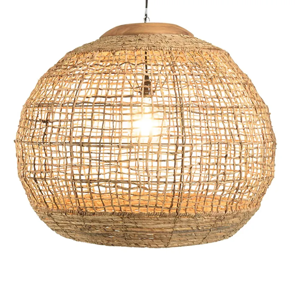 Suspension ‘boule’ 83x83cm en abaca couleur naturelle et teck. Article en Abaca (chanvre de Manille)/Acier. Dimension 83 x 83 x 66 cm.