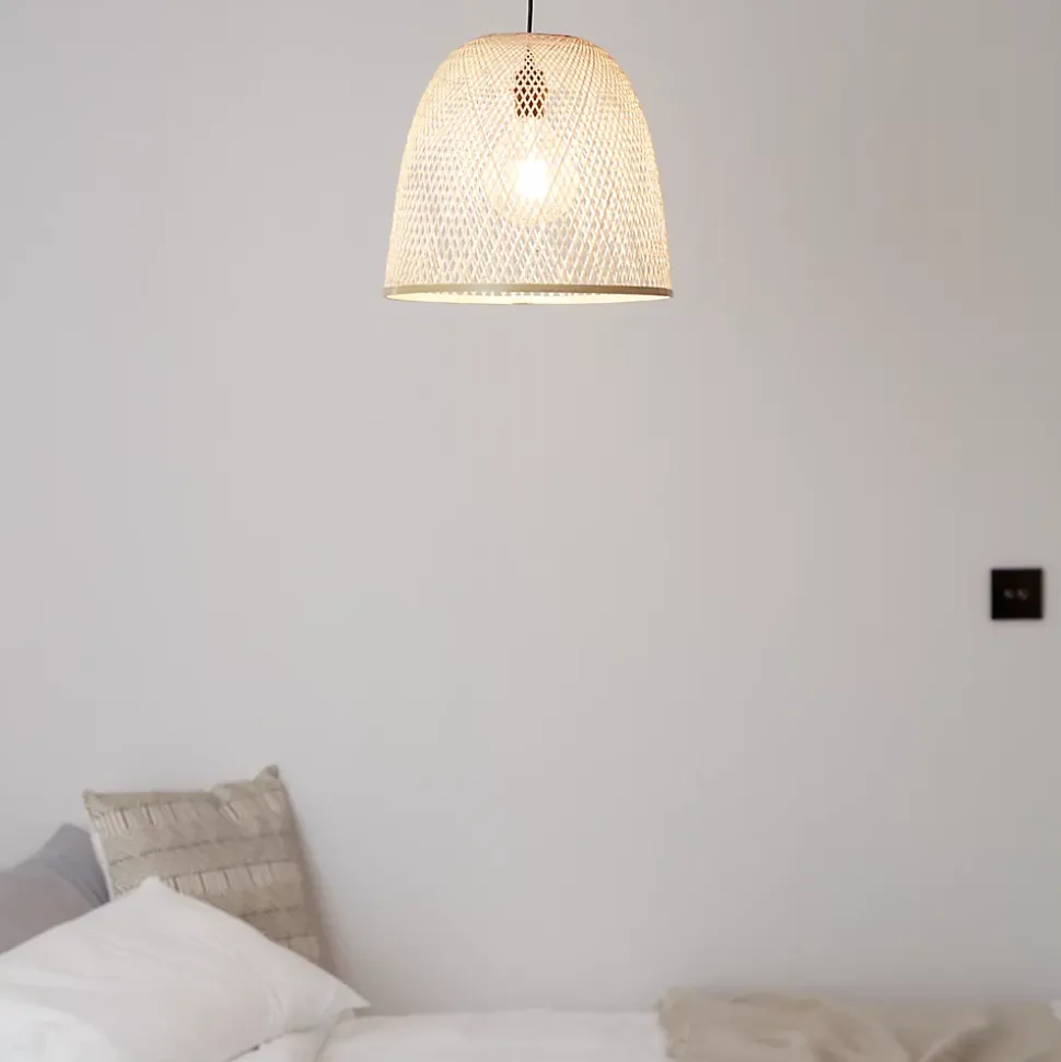 Nos suspensions ont été conçues dans un certain nombre de formes, de matières et de finitions pour vous permettre de trouver facilement celle qui vous convient. Cette suspension en fibre naturelle peut parfaitement servir de source de lumière principale