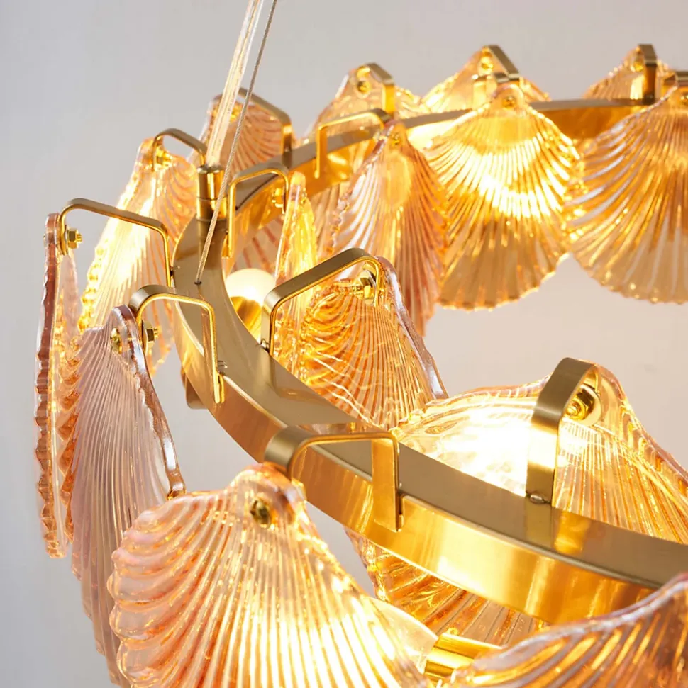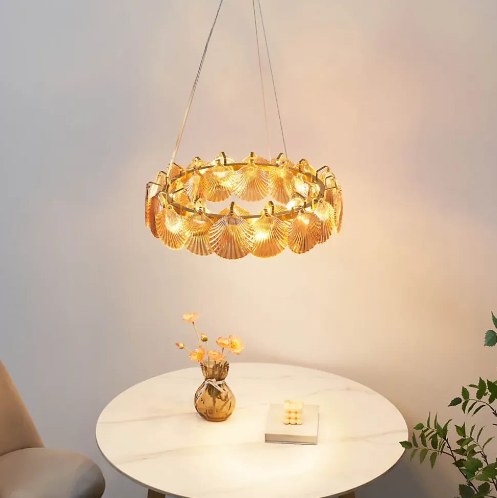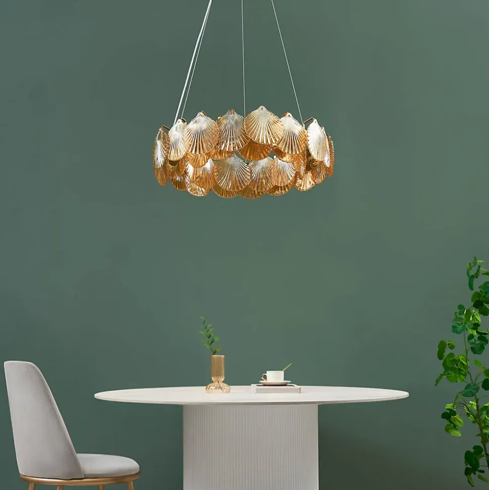 La suspension Amanda, avec sa finition en laiton et ses verres ambrés en forme de coquillage, apporte une touche d’originalité à votre espace. Suspendus à un anneau en métal, les verres créent une ambiance lumineuse unique. Ce luminaire peut être ajusté en hauteur et fonctionne avec 6 ampoules E14 (non fournies), offrant un éclairage à la fois pratique et très décoratif. Un choix idéal pour un intérieur qui ne passera pas inaperçu.) Assemblage à faire par vos soins (
