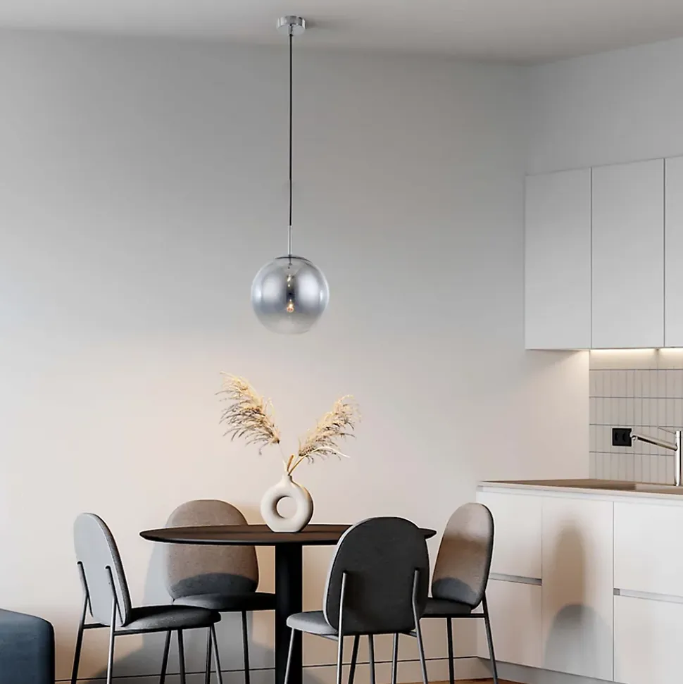 Suspension chromée La suspension Palla, petite et simple, est en verre chromé. Son abat-jour présente une forme sphérique classique. La lampe Palla est idéale pour des pièces comme le salon ou la salle à manger. Elle est du plus bel effet seule, mais vous pouvez aussi créer une composition lumineuse unique en l’associant à d’autres lampes de la collection Palla. La suspension Palla en détail Type de lampe : Suspension Palla, petite et simple. Dimensions : La lampe mesure 120 cm de haut et son abat-jour 15 cm de diamètre. Assez grande, elle constitue, outre sa fonction d’éclairage, un véritable élément décoratif qui sublimera n’importe quel intérieur. Matériaux et couleurs : La lampe est en verre chromé. Source lumineuse : La lampe est compatible avec les ampoules E14 et possède une douille simple. Utilisation de la petite suspension Palla La suspension Palla est un choix idéal Pour les salles à manger, les salons et les cuisines, au-dessus des îlots centraux. La lampe Palla présente une élégante finition chromée et une forme sphérique intemporelle. Elle s’harmonise aussi bien avec les intérieurs modernes que classiques. Sa couleur chromée se marie parfaitement avec les accessoires argentés, créant ainsi un ensemble harmonieux. La collection de suspensions Palla offre une infinité de possibilités pour associer les lampes et créer l’éclairage de votre choix. Deux tailles sont disponibles, ainsi que trois finitions : chrome, or et cuivre.