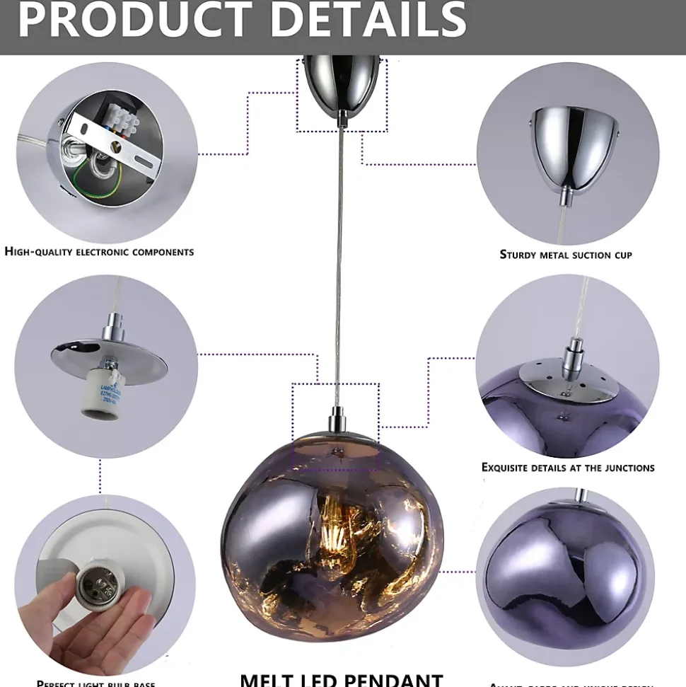 Design Contemporain :Inspirée de l’emblématique lampe Melt de Tom Dixon, la MAGMA allie élégance et modernité, avec un design contemporain incarnant innovation et créativité.Abat-jour en Verre Sculptural :Disponible en trois couleurs, son abat-jour en verre présente un aspect fluide et sculptural, évoquant une transformation constante entre états liquide et solide, avec un effet visuel semblable au verre fondu caractéristique de la Melt.Construction et Détails :Inclut un pavillon et un support d’abat-jour en métal, garantissant durabilité et finition sophistiquée qui complètent son design inspiré des pièces haut de gamme.Compatibilité des Ampoules :Compatible avec une ampoule E27 G45 (non incluse), permettant de personnaliser l’éclairage pour créer des ambiances chaleureuses et modernes.Câble Ajustable en Hauteur :Dispose d’un câble transparent ajustable en hauteur, suspendu au plafond grâce à un pavillon central, s’adaptant aisément à divers espaces et besoins.clairage Captivant :Avec son design unique et son éclairage fascinant, la lampe MAGMA devient le point focal de tout espace intérieur, offrant une esthétique unique inspirée des designs organiques de Tom Dixon.Spécifications lectriques :Tension nominale : 220-240V ACPuissance maximale : 40WDouille : E27 – G45Indice de protection : IP20 (Usage intérieur)Couleurs Disponibles :DoréChroméOr RoseDimensions :Diamètre : 280 mmHauteur : 250 mmLongueur du Câble : 1320 mm