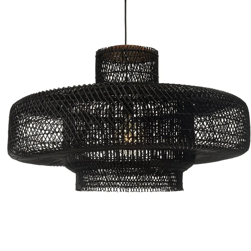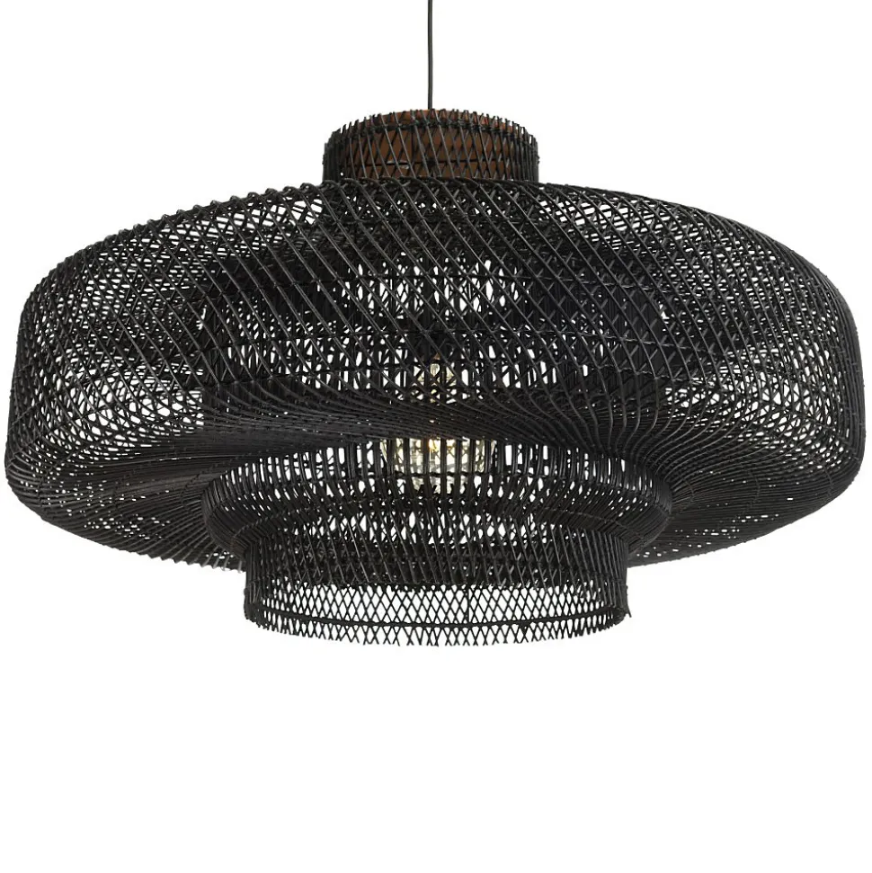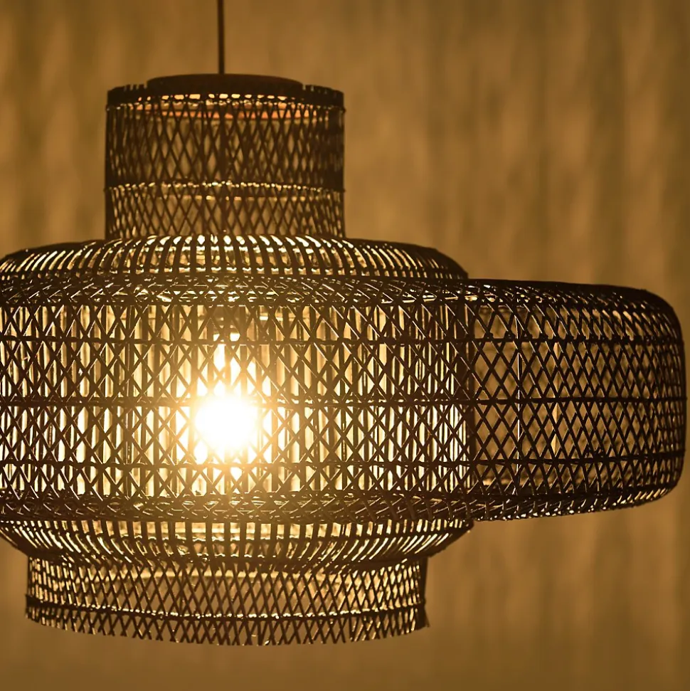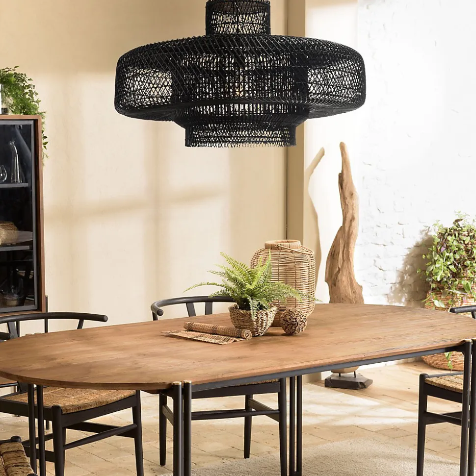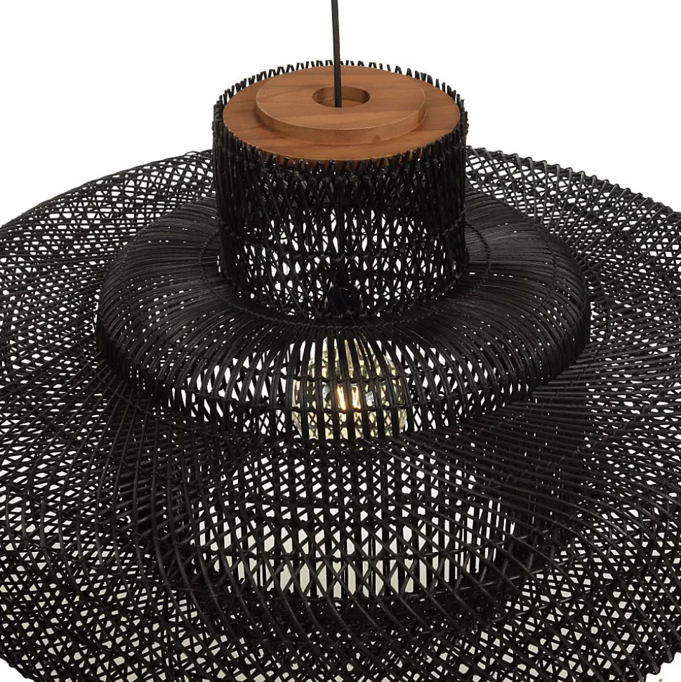 Suspension ‘double’ 90x90cm en rotin couleur noire et teck. Article en Rotin/Teck recyclé/Acier. Dimension 90 x 90 x 52 cm.