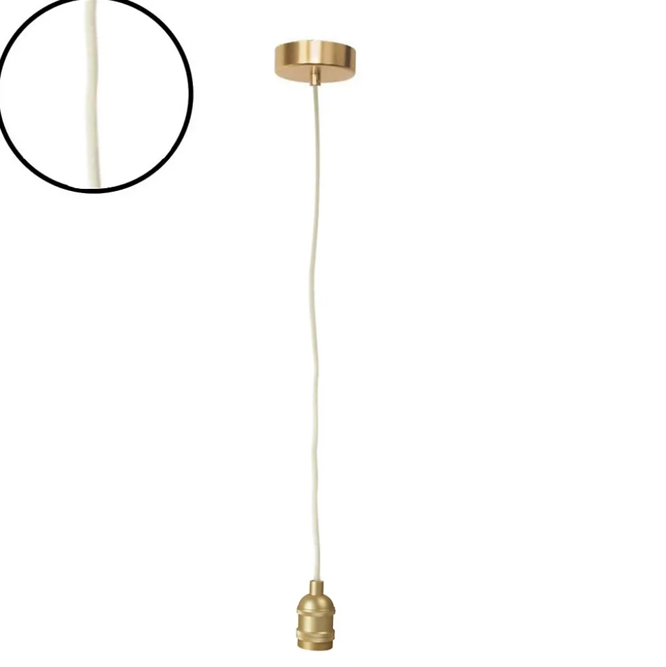 Une douille E27 pour y mettre votre ampoule (à laquelle vous pouvez aussi accrocher un abat-jour si vous le souhaitez), un fil électrique gainé de textile et une rosace en métal pour cacher le branchement à votre mur ou plafond. . La rosace dispose d’une vis qui bloque le fil. Si vous le dévissé, vous pourrez raccourcir le fil à votre convenance, puis il faudra revisser afin que le fil reste à la bonne hauteur.. C’est l’accessoire idéal pour composer un luminaire (applique, lustre.) qui se fondra totalement dans votre intérieur.. Suspension avec douille en métal doré satiné, 110cm de câble d’alimentation gainé de corde naturelle.. Compatible avec tous types d’ampoules E27 d’une puissance maximum de 40W.. Ampoule vendue séparément. Usage intérieur uniquement. . Taille : 110 cm . Coloris : Doré . . Vendu à l’unité