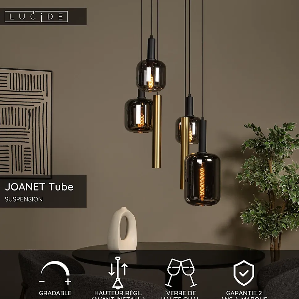 Plus, c’est mieux. Encore plus si cela dépend de cette suspension, nommée Joanet. Pas une ou deux, mais pas moins de six ampoules sont suspendues avec style à la plaque de montage. Entourées d’une élégante boîte de verre, avec un dialogue entre les zones claires et fumées. Les formats variés de la verrerie apportent du dynamisme au luminaire. Pour profiter pleinement de la magie, choisissez des ampoules filaments. Connectez Joanet à un gradateur pour créer une véritable atmosphère.