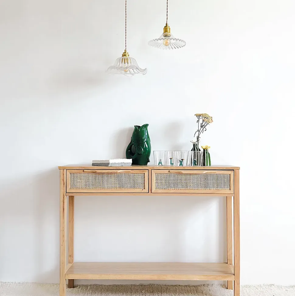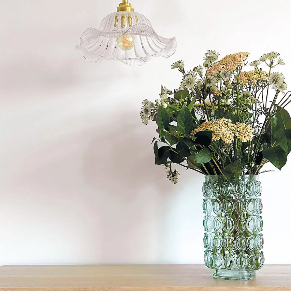 Suspension Jeanne en verre transparent strié et monture dorée vieillie Cette suspension fait partie de nos nouveautés Luminaire ! Elle est superbe et se fond très bien dans les intérieurs vintage, bohème, naturel et bien d’autres … Esprit rétro, en verre transparent, elle est équipée d’un cordon en textile torsadé et d’une rosace pour le plafond dorée vieillie. Livrée tout équipée (sauf ampoule) Diamètre 25 cm / cordon tissé beige longueur 120cm et rosace (monture) en métal finition doré antique. Ce joli luminaire sera parfait dans une cuisine, au dessus d’une table de repas ou encore en lampe de chevet, la seule limite est votre imagination. Retrouvez d’autres luminaires ici >> Luminaire style ancien