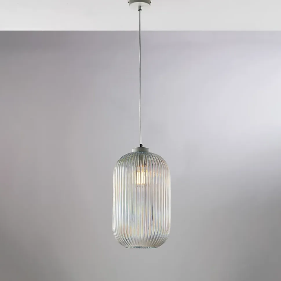 Lampe à suspension en fer laqué blanc avec câble électrique orientable et diffuseur en verre soufflé transparent à décor rayé en relief, 1 lumière – H.41 – MAX 141 – Ø20 Mesures du produit : H