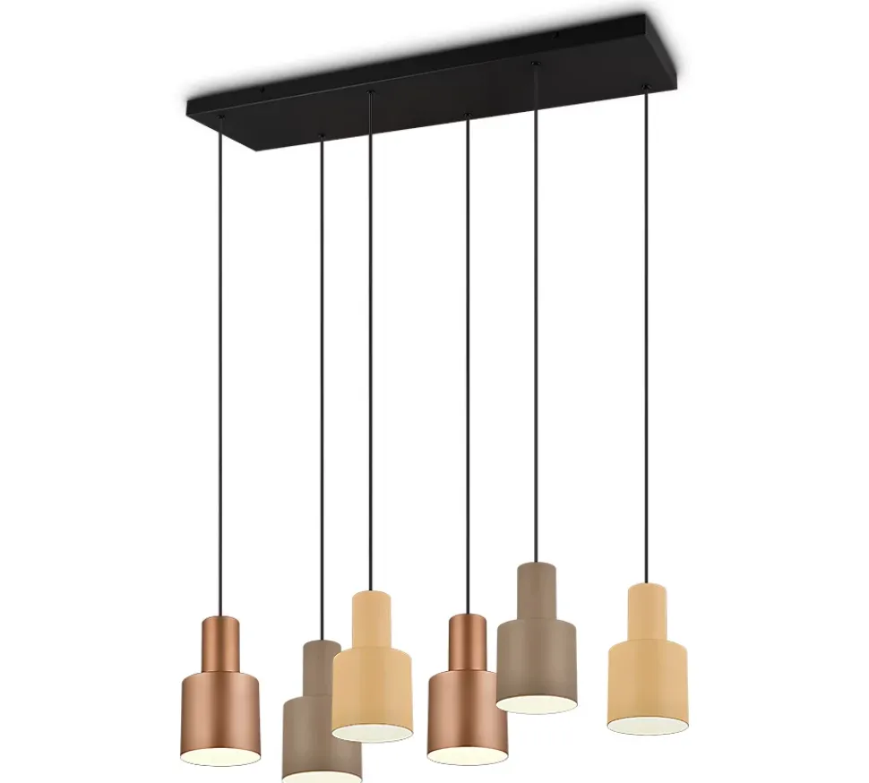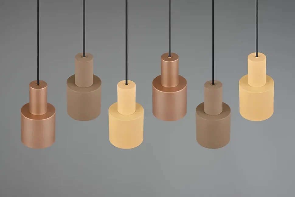 Les caractéristiques techniquesLa Suspension AGUDO de Trio se distingue par son design moderne et minimaliste. Elle est équipée de six abat-jours en métal de couleurs naturelles (taupe, beige et café), offrant une combinaison de hauteurs différentes pour un effet visuel unique. Cette suspension est parfaite pour apporter une touche d’élégance au-dessus de votre table de salle à manger ou dans votre salon.Réglable en hauteur, elle permet un montage facile au plafond, s’intégrant ainsi harmonieusement à votre intérieur. Le corps en métal de cette suspension est fini dans une teinte mate pour un look chic et moderne.Les avantages esthétiquesLa combinaison des abat-jours en métal et des couleurs naturelles créera une ambiance chaleureuse et accueillante dans votre pièce. Grâce à son design épuré, cette suspension peut être utilisée aussi bien dans des intérieurs modernes que dans des décors plus traditionnels, tout en offrant une lumière douce et agréable.Conseils d’installation et utilisationLa Suspension AGUDO est idéale pour illuminer vos espaces de manière pratique et élégante. L’installation est rapide grâce à son système de suspension au plafond et sa conception légère. Pour une ambiance chaleureuse, nous vous recommandons d’opter pour des ampoules LED à lumière chaude.