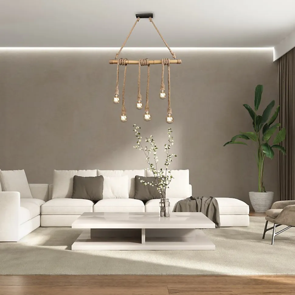 Les caractéristiques techniquesLa suspension Led Wilma est constituée d’une rosace en métal noir mat, d’une barre en bambou et de câbles de suspension en corde de sisal réglables en hauteur.Vous pourrez y adapter 6 ampoules Led culot E27 d’une puissance maximale de 10 watts chacune. A vous de choisir leur intensité et leur température de couleur afin de définir l’ambiance que vous souhaitez.De par ses dimensions imposantes (1,50 m de haut pour 1 m de largeur) , ce luminaire conviendra plus particulièrement à une vaste pièce avec grande hauteur sous plafond.Les avantages esthétiques Ce magnifique luminaire de grande dimension a été conçu par les designers de la maison Trio dans l’esprit actuel de matériaux naturels, très tendance en ce moment.Avec sa barre en bambou et ses suspensions en corde de sisal, il conviendra particulièrement dans un intérieur contemporain ou rustique et une vaste pièce haute de plafond.Il trouvera sa place dans votre salle à manger au dessus d’une grande table rectangulaire où sa longueur de 1 mètre permettra à tous les convives d’être efficacement éclairés ou dans un salon cathédrale.Afin de renforcer l’originalité de ce lustre, nous vous conseillons de l’équiper d’ampoules à filament. Si vous voulez créer une suspension unique, vous pouvez installer des ampoules de designs différents.