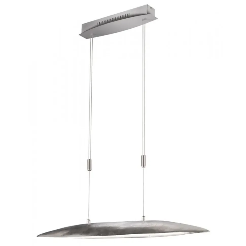 blLes caractéristiques techniquesLa suspension lumineuse Colmar 105 nickel de chez Fischer & Honsel dispose d’une source de lumière dimmable (variateur non fourni) avec Led intégrée.Elle s’ajuste en hauteur grâce à ses 2 élégants contre poids en alu brossé qu’il suffit de faire coulisser le long de 2 câbles en inox tressés. Réglable de 105 cm à 166 cm, le lustre Colmar s’adaptera parfaitement aux hauts plafonds.Ce luminaire Led est économique puisqu’il ne consomme que 30 watts. De plus, sa durée de vie de 30.000 heures permet de vous proposer une garantie de 7 ans sur les Leds.Il diffuse une agréable lumière blanc chaud qui grâce à la technologie CCT peut être variée : 3 températures au choix 2700 kelvins – 3350 kelvins – 4000 kelvins ; tout en éclairant efficacement avec ses 3000 lumens.Les avantages esthétiques Avec son design chic et unique, cette suspension haut de gamme donne à votre intérieur une touche de luxe inédite.L’aspect extérieur de l’abat-jour est obtenu à laide d’un microbillage de la surface métallique avec une oxydation contrôlée et la pose d’un vernis de protection.La suspension Colmar trouvera sa place au dessus d’un îlot central ou d’une table de salle à manger. Elle intégrera facilement une décoration au style industriel ou contrastera avec votre décoration en l’associant à du mobilier en bois.Colmar existe en Nickel mat 140 cm (ref60512), nickel mat 105 cm (ref13219) et noir 105 cm (ref 13368)