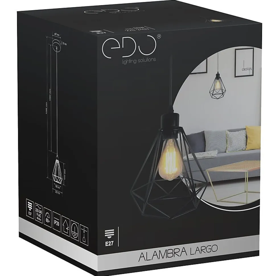 Suspension LOFT ALAMBRA LARGO avec douille E27 – noire. Luminaire d’intérieur idéal pour la maison le bureau ou le restaurant. Finition mate au style industriel. Abat-jour géométrique parfait pour les intérieurs de type loft.DONNÉES GÉNÉRALES:✔️Utilisation : intérieur✔️Type de montage : en saillie✔️Lieu d’installation : plafond✔️Type de connexion : borne à vis✔️Couleur : noir✔️Finition : mate✔️Matériau : acierDimensions [mm] :✔️ rosace : ø100x24mm✔️abat-jour : 200x205x154mm✔️ hauteur totale : 1310mm✔️ longueur du câble : 1040mm✔️Réglable : non✔️Abat-jour : mat✔️Douille incluse : oui✔️Type de douille : E27✔️Nombre de douilles : 1✔️Source lumineuse incluse : nonDONNÉES TECHNIQUES:✔️Puissance maximale [W] : 60W✔️Tension nominale [V] : 220–240 V AC✔️Fréquence nominale [Hz] : 50–60 Hz✔️Indice de protection : IP20✔️Classe de protection : I✔️Contenu en mercure : non✔️Température ambiante [°C] : -20…+50°C