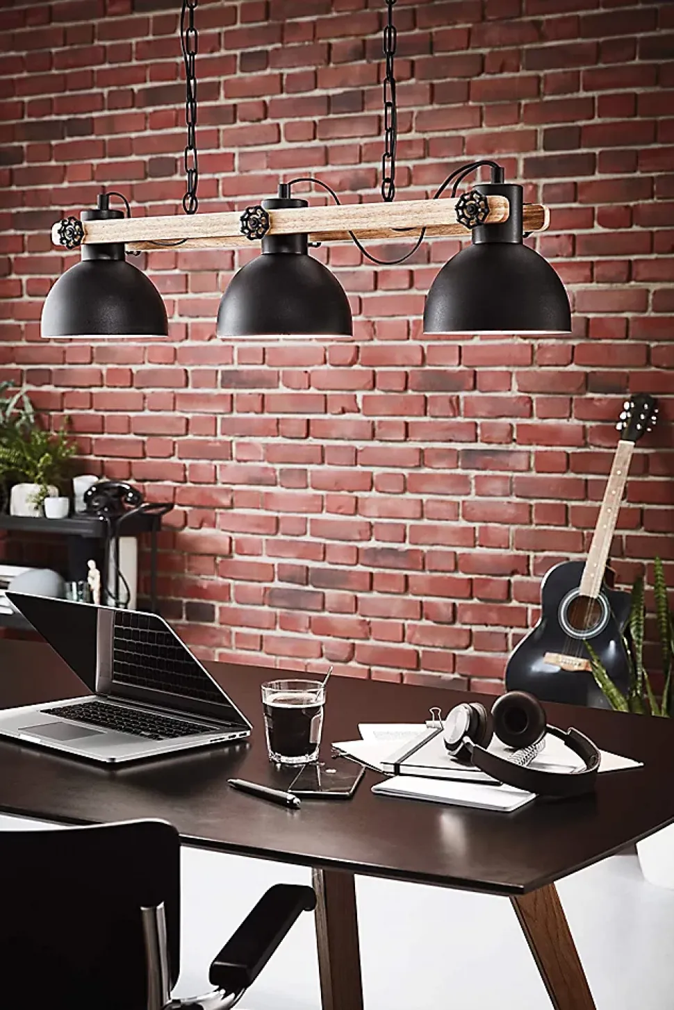 - La suspension LUBENHAM se compose de trois abat-jours pivotants en métal noir dotés d’une face intérieure de couleur crème. Les abat-jours sont fixés à un corps en métal et bois, lui-même suspendu à deux chaînes à maillons.