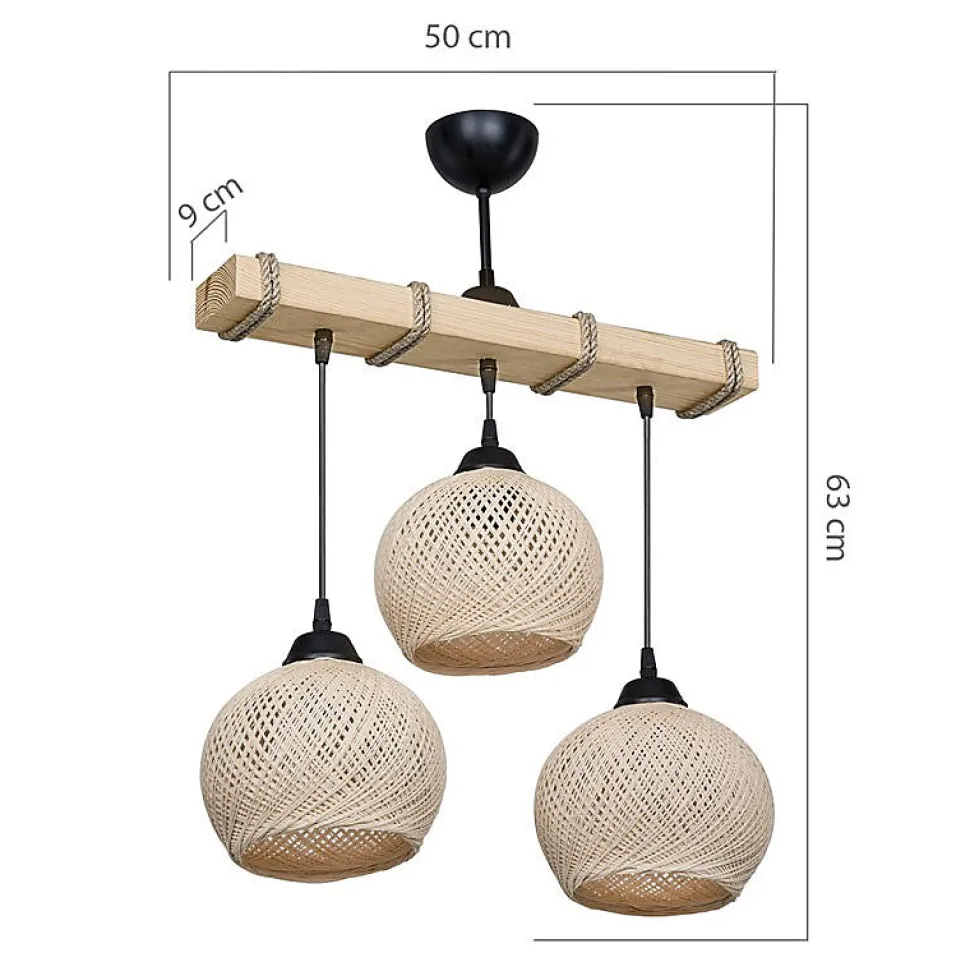 Spécifications techniques :Structure en métal de haute qualité résistante à l’usure et au temps et bois naturel d’une grande durabilité.La conception du chapeau permet à la lumière de se diffuser de manière étonnante lorsque la lampe est allumée.Il dispose de sièges pour trois ampoules de 60 W qui ne sont pas incluses dans l’emballage.Disponible en couleur crème-naturelle.Dimensions du produit :Longueur : 50 cm .Largeur : 20 cm .Hauteur : 63 cm .Dimension de chaque globe : D17x15 cm