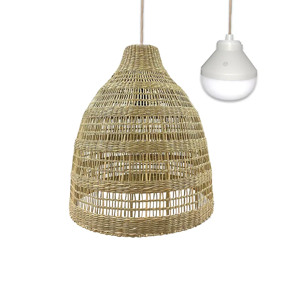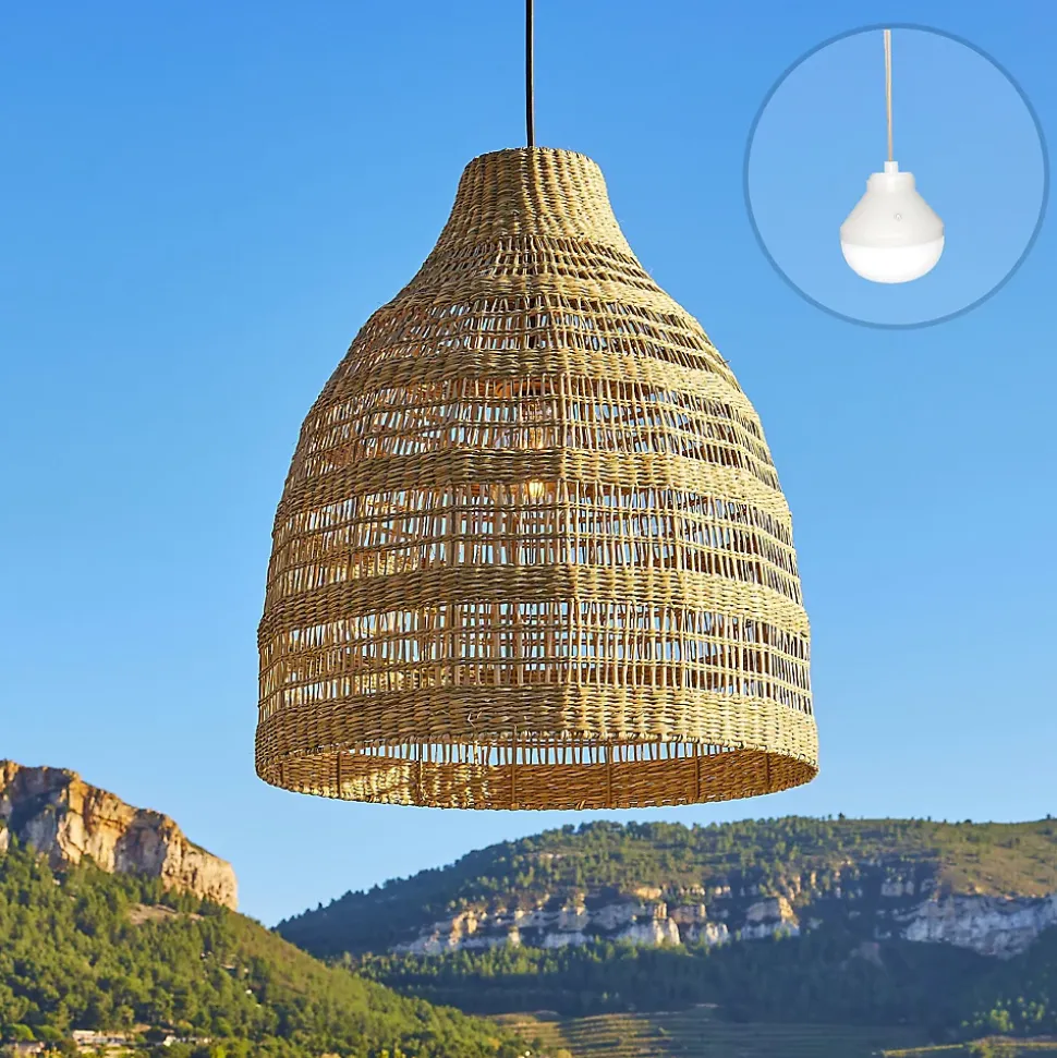 La suspension artisanale Freya Long Nomad est fabriquée en herbe marine naturelle offrant un tressage artisanal élégant. Ce luminaire au style ethnique chic de 49 cm de diamètre pour 56 cm de hauteur est livré avec l’ampoule LED autonome Lys proposant un éclairage blanc chaud et multicolore RGB. Grâce à sa télécommande et son système magnétique, elle se suspend librement partout sans aucun besoin de raccordement électrique fixe. Sa batterie rechargeable assure une autonomie technique de 12 heures pour illuminer vos espaces en toute autonomie. Certifiée IP44, elle est protégée contre les projections d’eau, idéale pour une terrasse ou sous une pergola. Maintenez l’abat-jour dans un endroit sec et protégé. Parfaite pour les repas en plein air, les apéritifs ou les soirées d’été, elle crée immédiatement une ambiance douce et accueillante. L’entretien reste simple : un chiffon doux suffit pour conserver un.