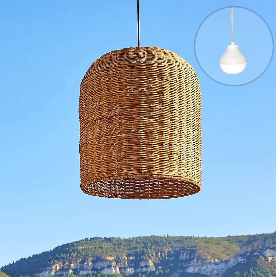 La suspension artisanale Giacomo Nomad est fabriquée en rotin naturel, une fibre résistante offrant un design ethnique chic. Ce luminaire de 40x40x45 cm est livré avec l’ampoule LED autonome Lys proposant un éclairage blanc chaud et multicolore RGB. Grâce à son système magnétique et sa télécommande incluse, elle se suspend librement n’importe où sans aucun câble fixe pour accompagner vos repas ou moments de détente. Sa batterie rechargeable assure une autonomie technique de 12 heures en toute autonomie. Certifiée IP64, elle résiste aux projections d’eau pour un usage extérieur fiable sur une terrasse ou un balcon. Maintenez l’abat-jour dans un endroit sec et protégé. Vous pouvez la disposer le long d’une pergola, d’une rambarde ou d’un mur pour structurer la lumière et mettre en valeur les volumes. Son style intemporel s’accorde aussi bien avec une décoration moderne qu’avec un esprit plus bohème ou.